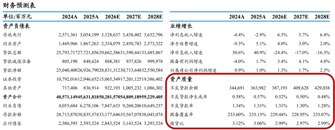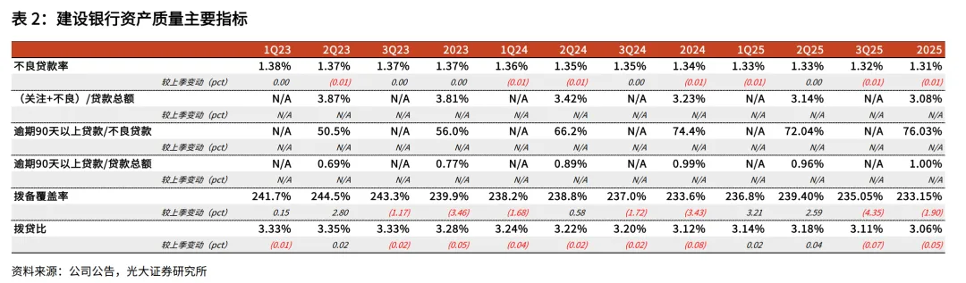 (1)整体优异:不良贷款率统一确认为1.31%的历史低点,关注类贷款占比显著下降(-12BP),拨备覆盖率维持在233%左右的较高水平,风险抵补能力充足 。