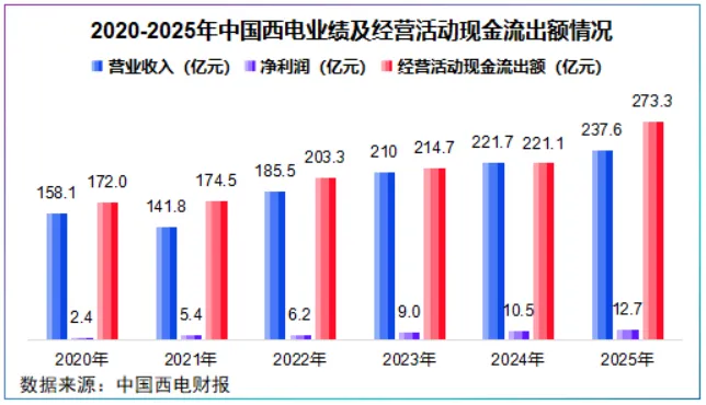 不仅如此,2020-2025年,中国西电经营活动现金流出额从不到180亿元快速攀升至273.3亿元,增幅达58.9%。