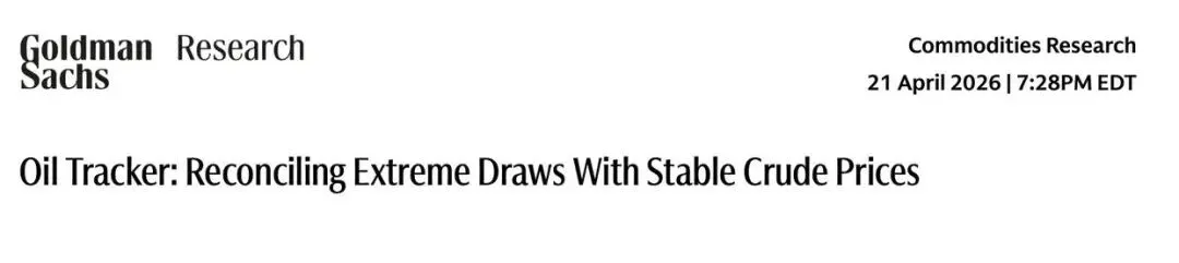高盛于2026年4月21日发布研报《石油市场追踪:调和极端库存下降与稳定油价之间的矛盾》(Oil Tracker: Reconciling Extreme Draws With Stable Crude Prices)。该报告描绘了当今原油市场出现的一个显著的“脱节”现象: