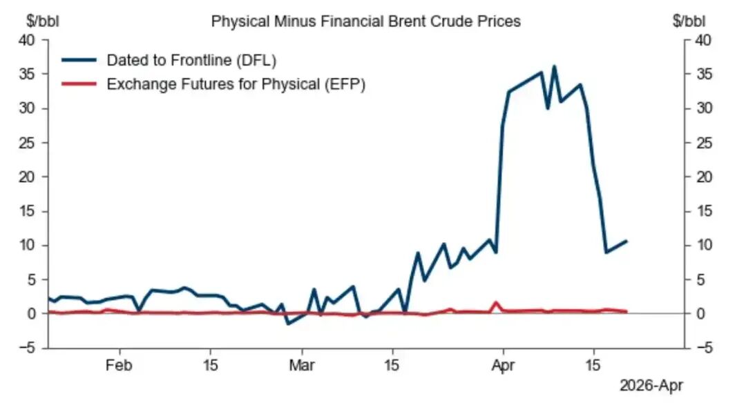 数据显示,用于衡量现货与期货价差的DFL(Dated-to-Frontline)指标一度飙升至近40美元/桶,尽管近期回落至约10美元/桶,但仍处于历史高位。