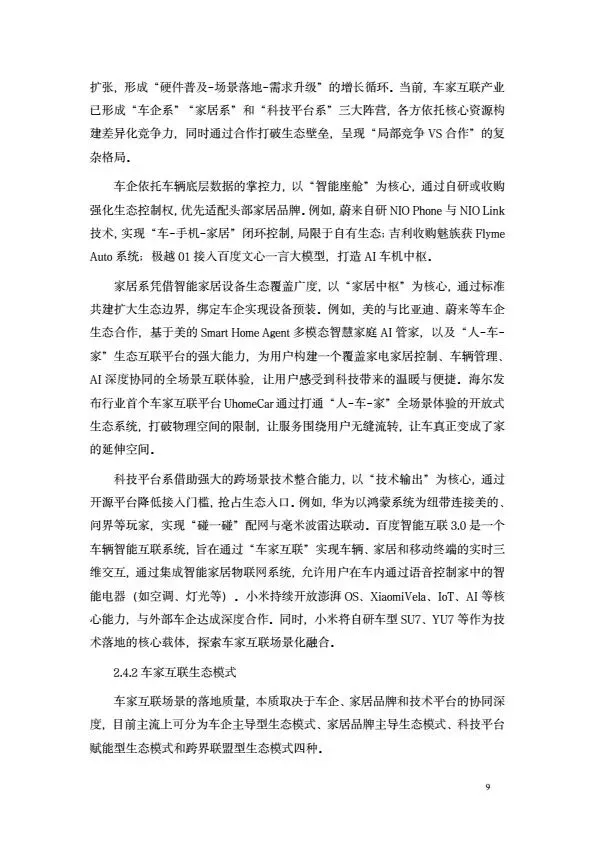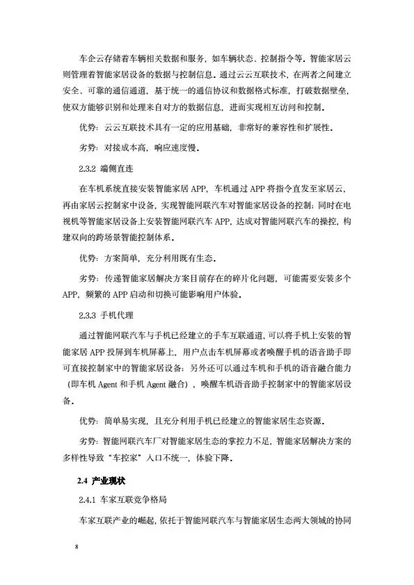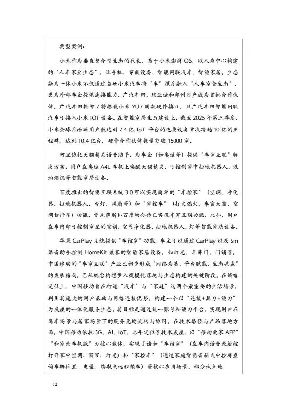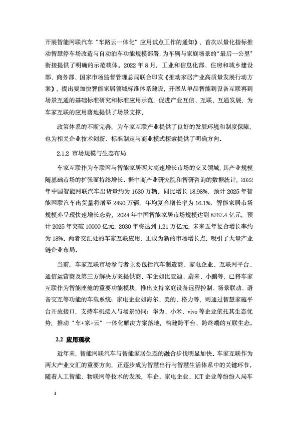 摘要:智能网联汽车与智能家居的协同融合,正成为智慧生活的重要发展方向,通过车家互联打通出行与居住场景,为用户构建一体化的智慧生活体验。《智能网联汽车与智能家居系统协同应用技术研究》系统梳理产业现状,详解“车控家”“家控车”“场景联动”三大核心应用模式,剖析当前互联互通、数据互通的产业痛点,提出可信数据空间、智能体互通的技术路径,以及标准建设、试点示范、开发者生态的落地建议,为车企、家电企业、ICT从业者提供产业发展参考。