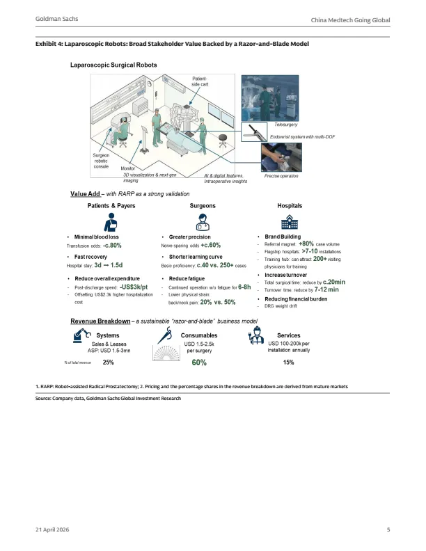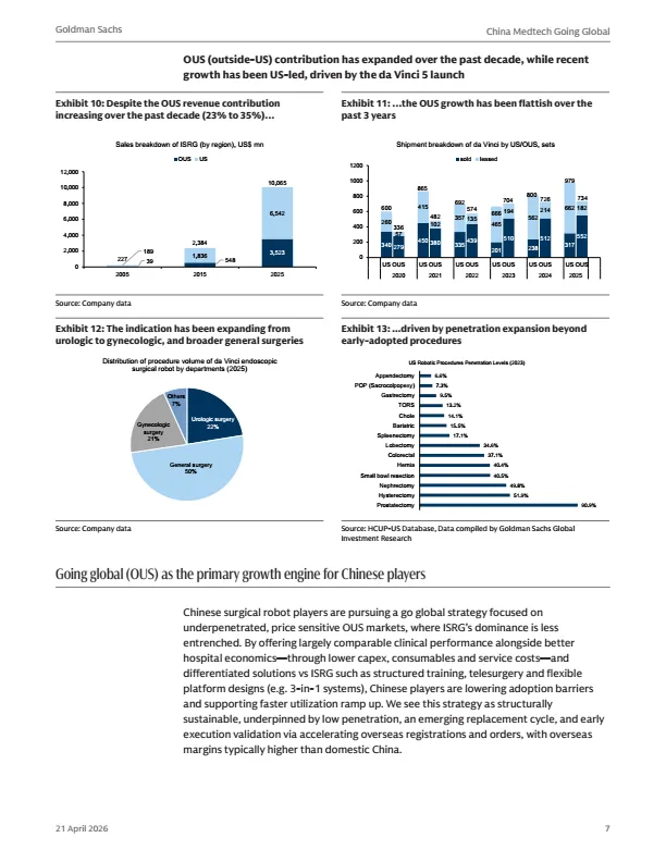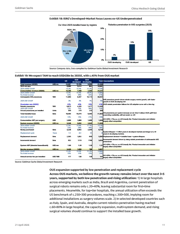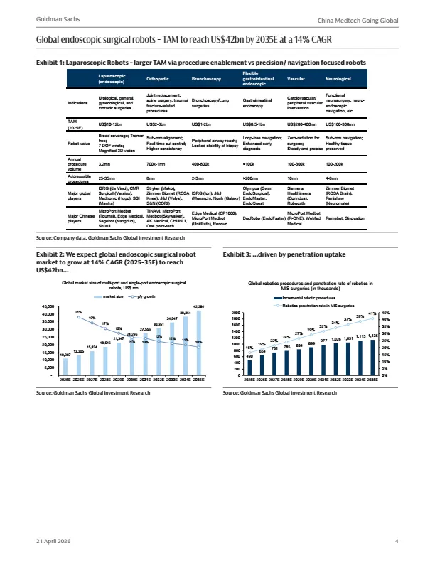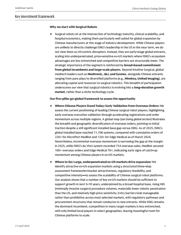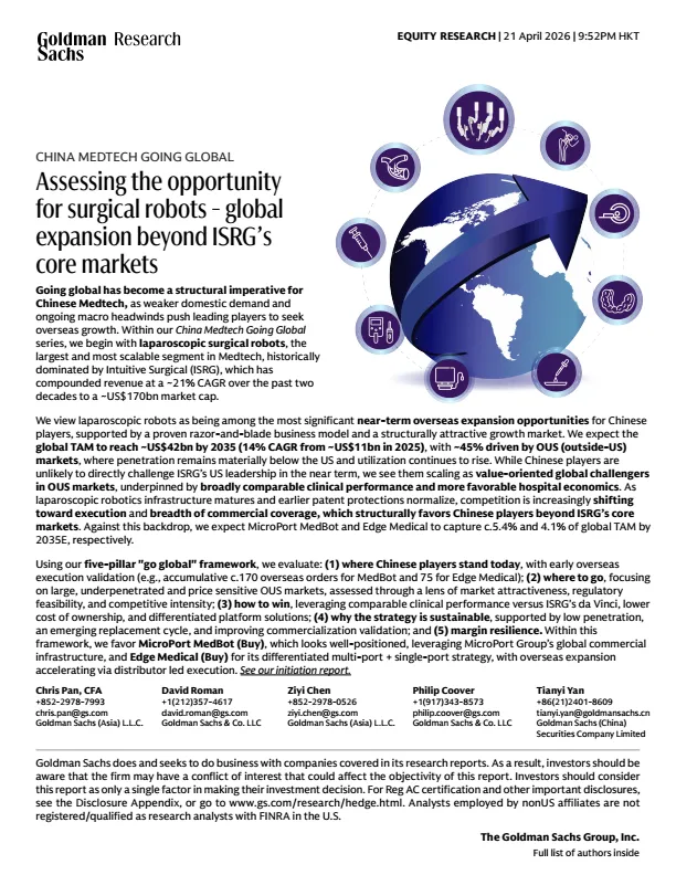 摘要:全球手术机器人市场预计2035年达420亿美元,十年复合增速14%,其中美国以外(OUS)市场贡献45%增量,成为行业新增长极。《手术机器人的机遇评估》指出,国产厂商难以短期挑战IntuitiveSurgical的美国龙头地位,但可凭借可比临床效果、更低的全生命周期成本,在渗透率低、价格敏感的OUS市场突围,同时存量设备替换周期也打开新入口。报告评估微创医疗机器人、天智航等企业的出海潜力,为医疗出海投资者提供参考。