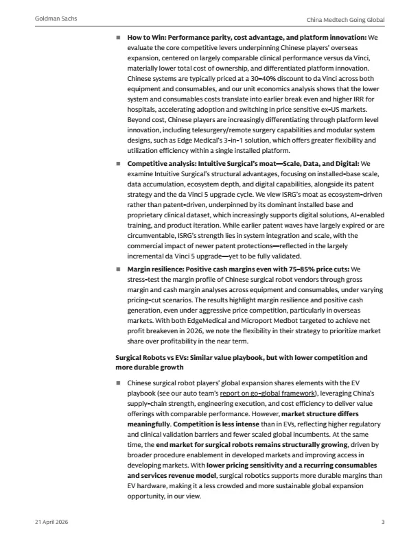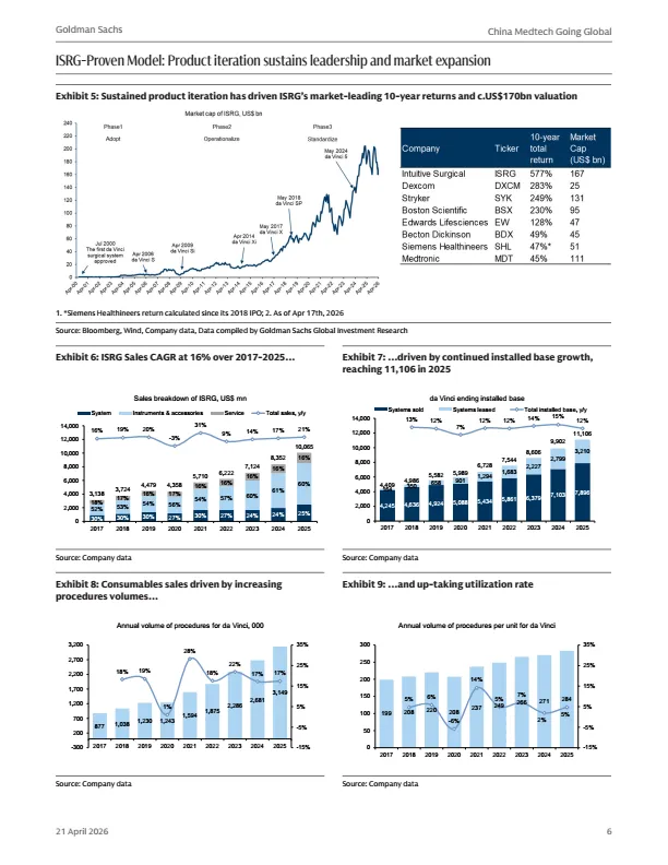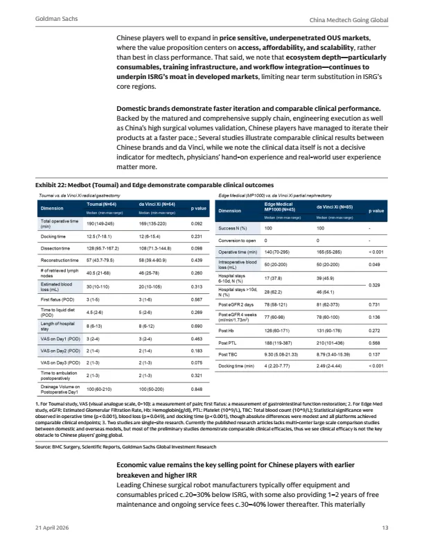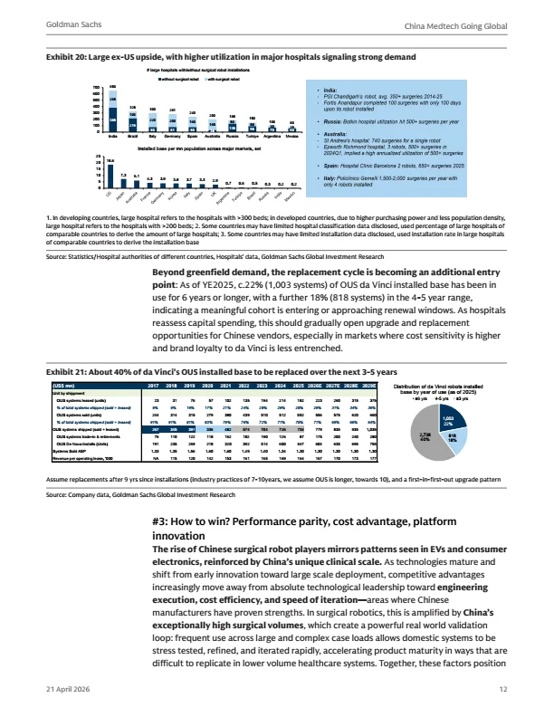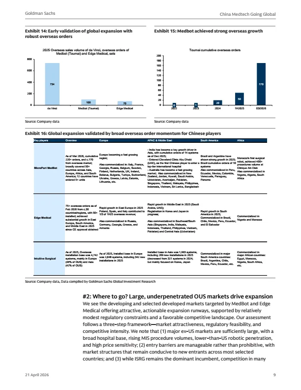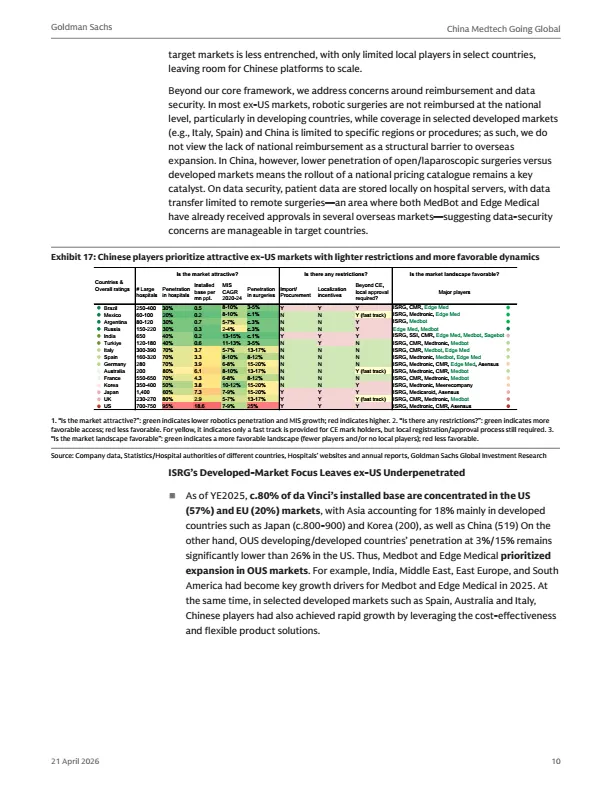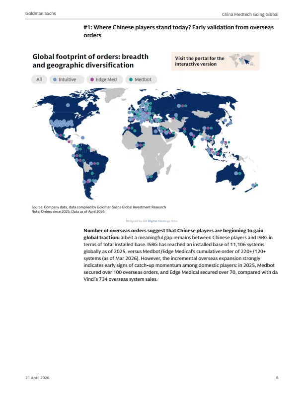摘要:全球手术机器人市场预计2035年达420亿美元,十年复合增速14%,其中美国以外(OUS)市场贡献45%增量,成为行业新增长极。《手术机器人的机遇评估》指出,国产厂商难以短期挑战IntuitiveSurgical的美国龙头地位,但可凭借可比临床效果、更低的全生命周期成本,在渗透率低、价格敏感的OUS市场突围,同时存量设备替换周期也打开新入口。报告评估微创医疗机器人、天智航等企业的出海潜力,为医疗出海投资者提供参考。