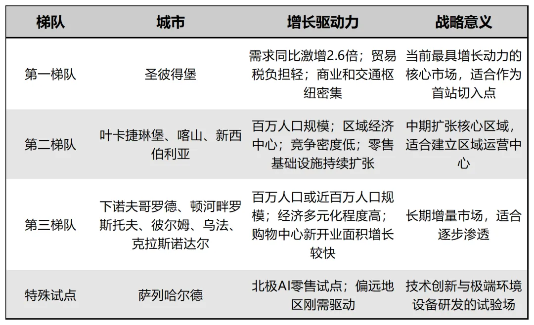 结合市场发展潜力,俄罗斯城市可划分为以下梯队: