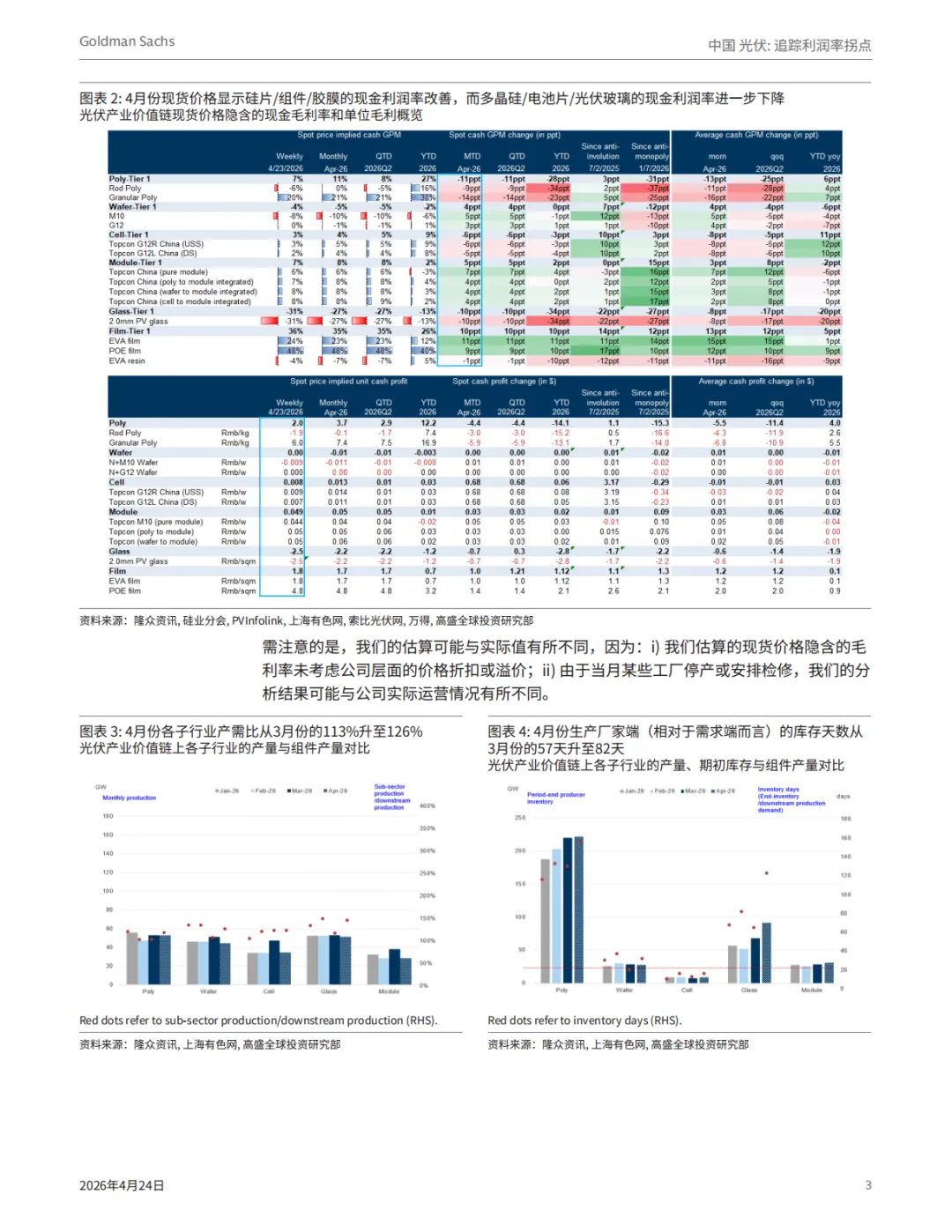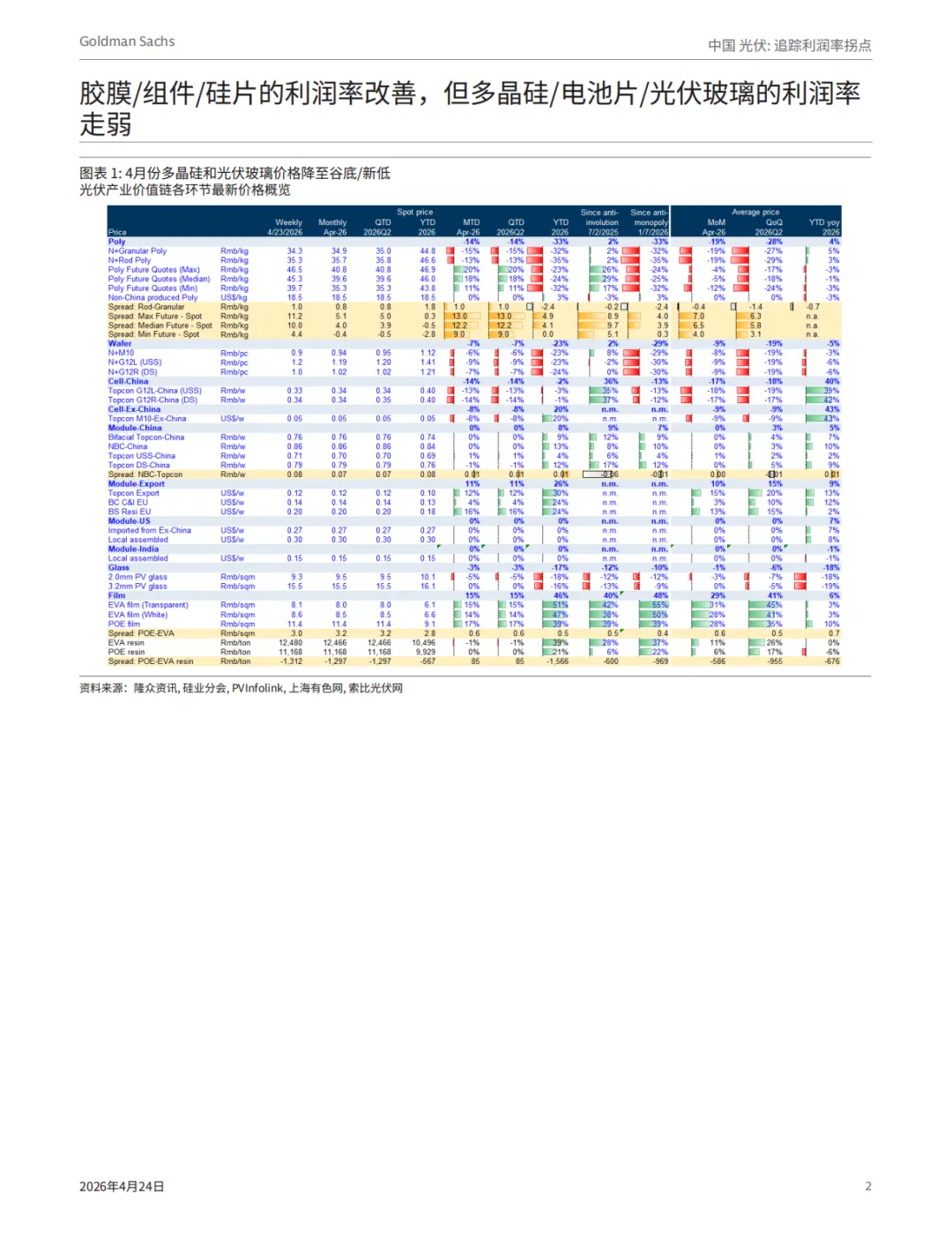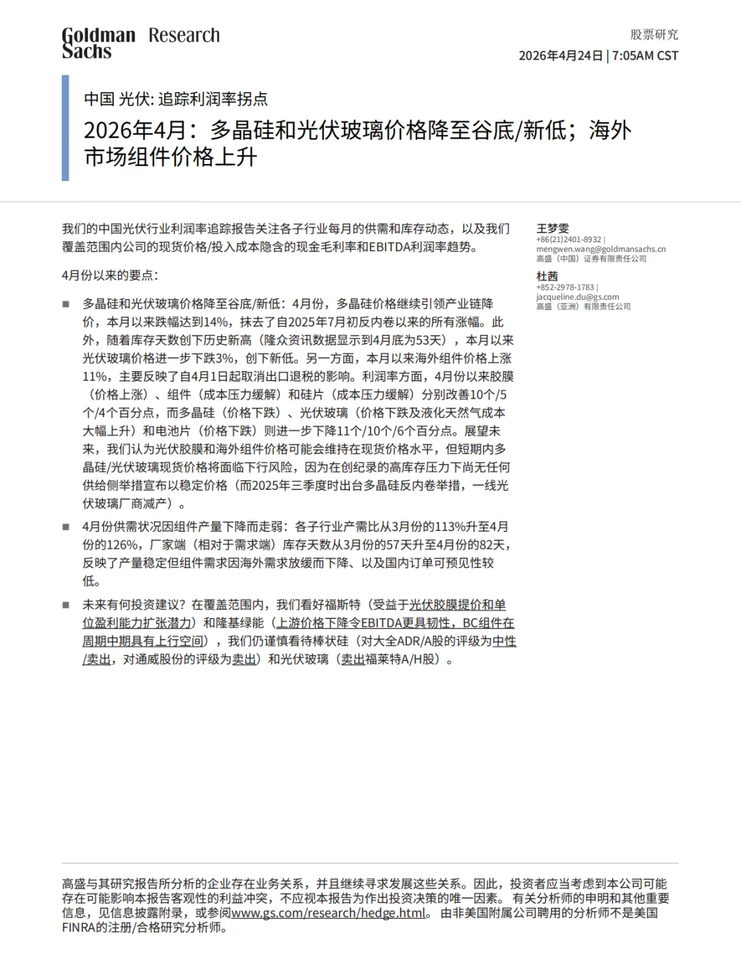 本期文章: 『研报』高盛-中国光伏行业: 追踪利润率拐点,2026年4月,多晶硅和光伏玻璃价格降至谷底新低;海外市场组件价格上升
