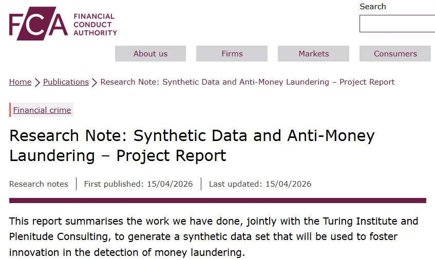 2026 年 4 月 15 日,英国金融行为监管局(FCA)发布《合成数据与反洗钱项目报告》,系统披露了其联合多方机构打造的全球首个监管级反洗钱合成数据集项目的完整研究成果。