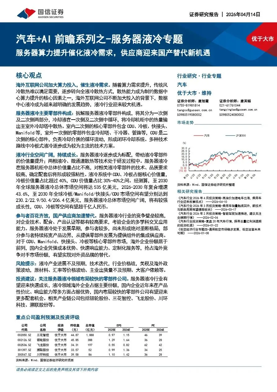 10、汽车+AI前瞻系列之-服务器液冷专题:服务器算力提升催化液冷需求,供应商迎来国产替代新机遇.pdf