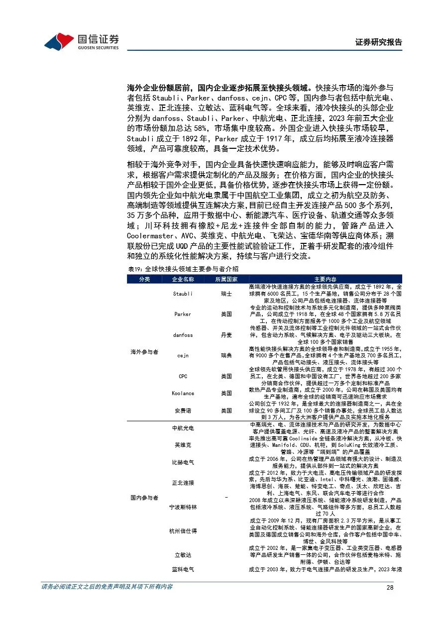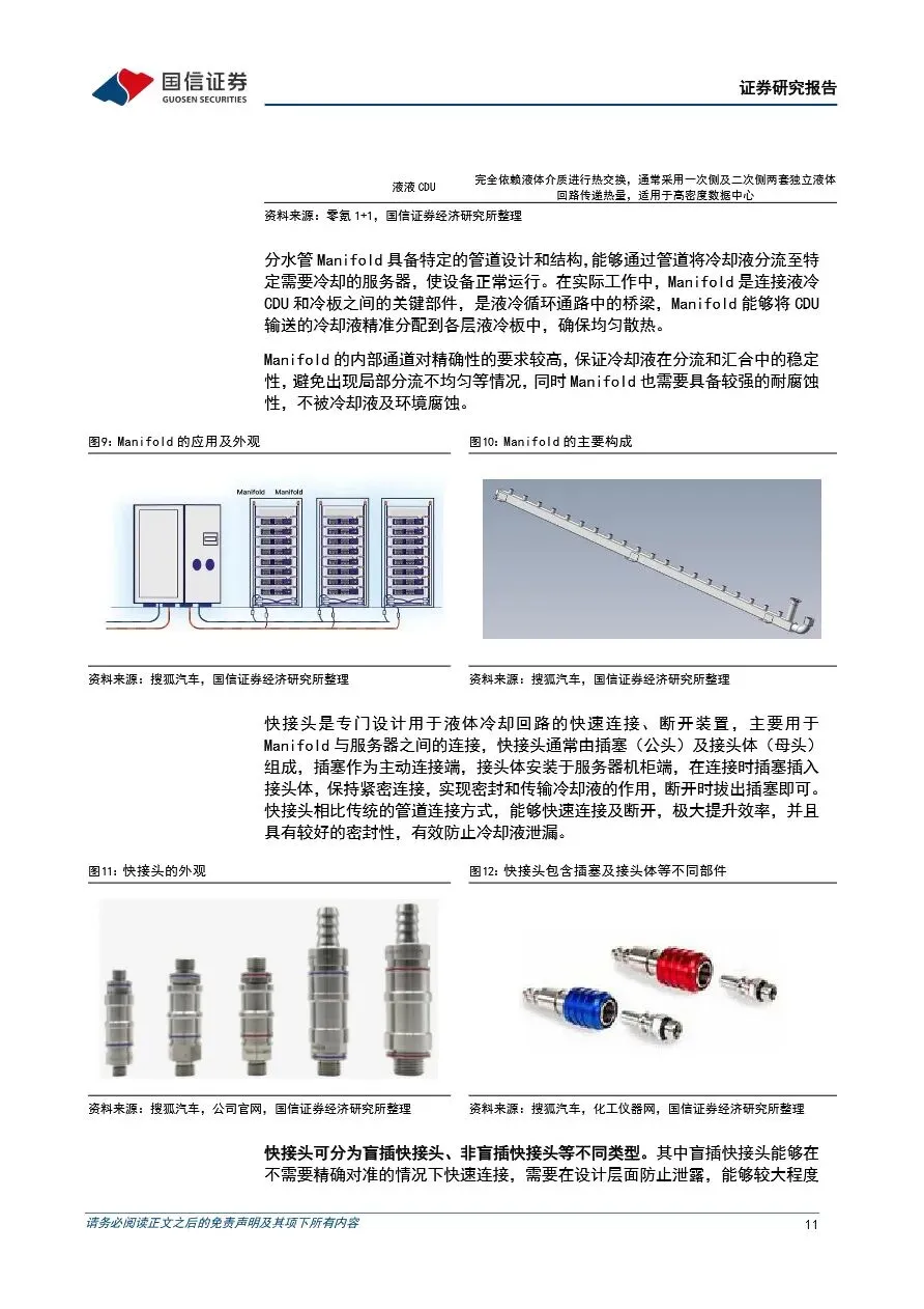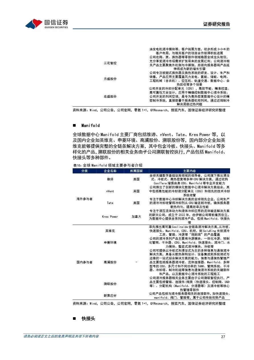 随着海外互联网公司对算力需求的持续提升,传统风冷散热方式已难以满足高密度数据中心的需求,服务器液冷技术因此迎来快速发展期。液冷方案通过高效散热,逐步成为服务器散热的主流选择,尤其是在AI服务器和高性能计算领域,其重要性日益凸显。服务器液冷系统涉及多个核心零部件,包括CDU、冷板、Manifold和快接头等,这些零部件的技术门槛较高,国内企业凭借性价比优势和快速响应能力,正逐步打破海外企业的垄断格局,实现国产替代。