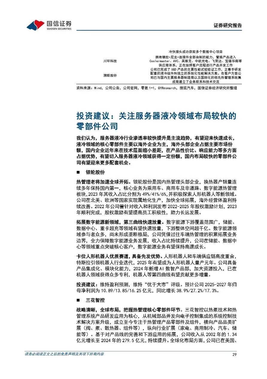服务器液冷市场的快速增长为相关零部件供应商带来了巨大的发展机遇。随着全球服务器机柜数量的增加和液冷技术的升级,CDU、冷板等核心零部件的市场需求将持续扩大。国内企业如银轮股份、三花智控、飞龙股份等,通过持续的技术研发和市场拓展,已在服务器液冷领域占据一席之地。这些企业不仅在国内市场取得显著成绩,还积极开拓海外市场,与北美等地区的头部客户建立合作关系,有望在全球服务器液冷市场中占据更大份额。同时,随着液冷技术的不断创新和应用场景的拓展,服务器液冷市场将迎来更加广阔的发展空间。
