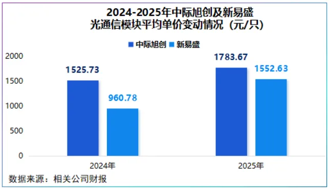 2025年,中际旭创光模块销售量同比大增44.55%,平均单价为1783.67元/只,同比上涨16.91%,新易盛光通信设备销售量同比大增82.78%,平均单价同比上涨61.6%。