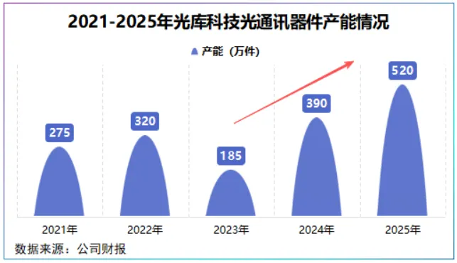 一个是销量。2025年,光库科技光通讯器件产能达到520万件/年,较2024年上涨了33.33%,三年年均复合增速达67.65%。