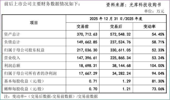 根据收购书,以2025年财务数据为基准,收购完成后,光库科技营收将增长53.24%,净利润增长94.04%。