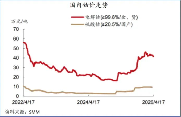 2025年2月,我国钴的现货价格一度低至16万元/吨左右,到了2026年4月,这一数字已经达到41万元/吨左右,涨幅高达160%。