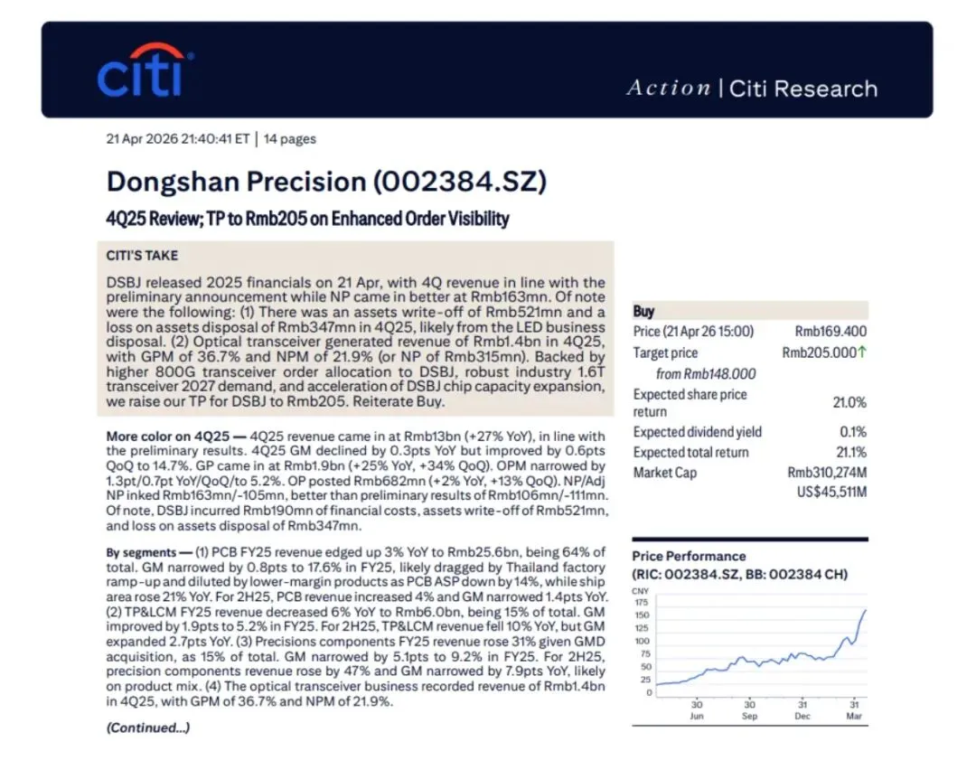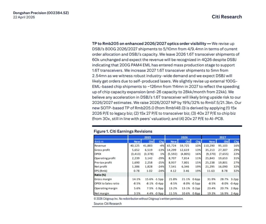 东山精密正从传统PCB制造商向“光模块+光芯片”高附加值赛道转型。光模块业务已贡献近22%净利率,800G/1.6T订单及光芯片扩产将驱动2026-27年利润爆发式增长。花旗大幅上调目标价至205元,重申买入。建议关注光模块订单兑现及芯片产能爬坡进度。