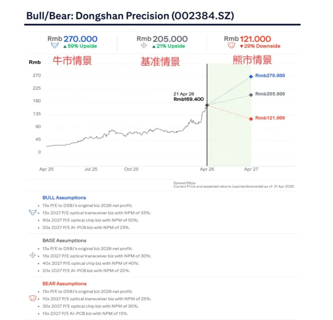牛市情景(光模块净利率35%、芯片净利率50%、AI PCB净利率25%)目标价270元,上行空间59%;熊市情景目标价121元,下行29%。