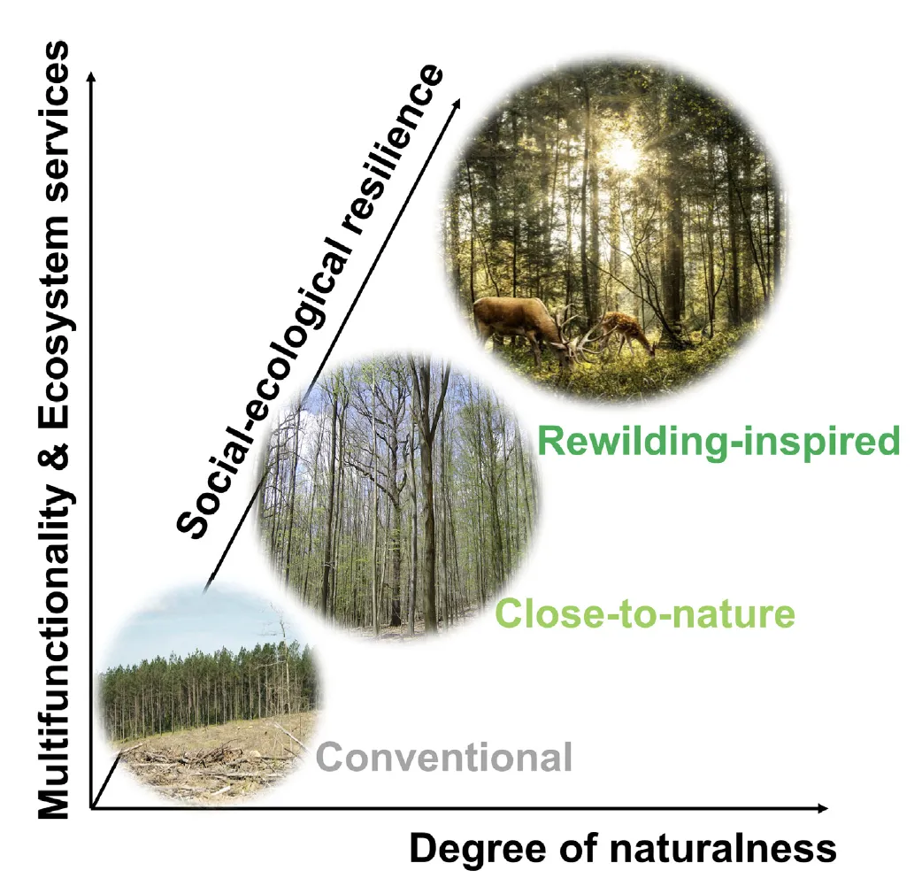 上图来源于文章中,用以解释传统林业、近自然林业、再野化导向森林经营之间的区别。传统林业位于左下角,主要依赖高强度管理以实现木材生产,对自然过程依赖较少,系统韧性较低;近自然林业处于中间位置,在自然过程、生态服务供给和韧性方面均表现为中等水平;而再野化导向的森林经营则位于右上角,强调高度自然性,通过提升食物网复杂性、恢复自然扰动和促进远距离物种扩散,构建具有高生物多样性和强韧性的森林景观,使其既能适应气候变化,又能提供多种生态系统服务。