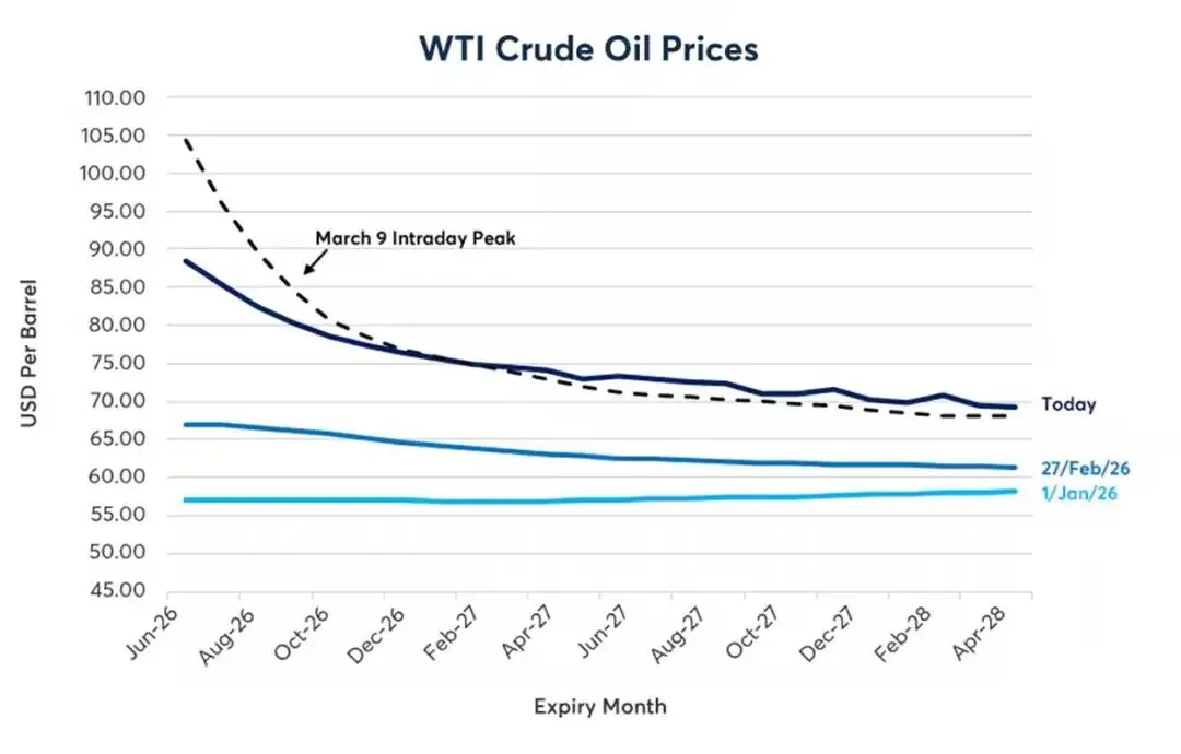 美国、以色列和伊朗自2月28日爆发冲突以来,原油期货曲线已进入急剧逆价差(backwardation)状态,这种情况甚至在4月7日宣布临时停火协议后仍然持续。2026年12月交割的WTI原油期货价格,与5月或6月交割的价格相比,价差一度高达40美元(图1)。这表明交易者预期当前因霍尔木兹海峡(Strait of Hormuz)关闭所造成的供应中断,很可能只是短期现象,现货价格或许会在年底前跌至70多美元的中间水平。但是,这种历史性的极端逆价差对投资人意味着什么呢?