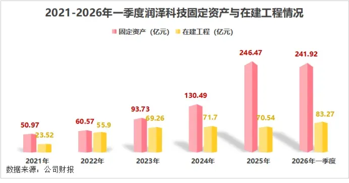 截至2026年一季度末,润泽科技的固定资产高达241.92亿元,较2024年明显提升,在建工程也达到了83.27亿元。