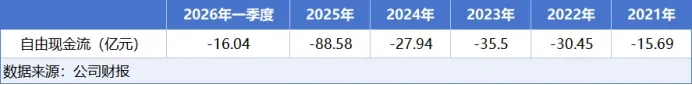 2025年,润泽科技的自由现金流达到-88.58亿元;即便到了2026年一季度,这一指标依然为-16.04亿元。