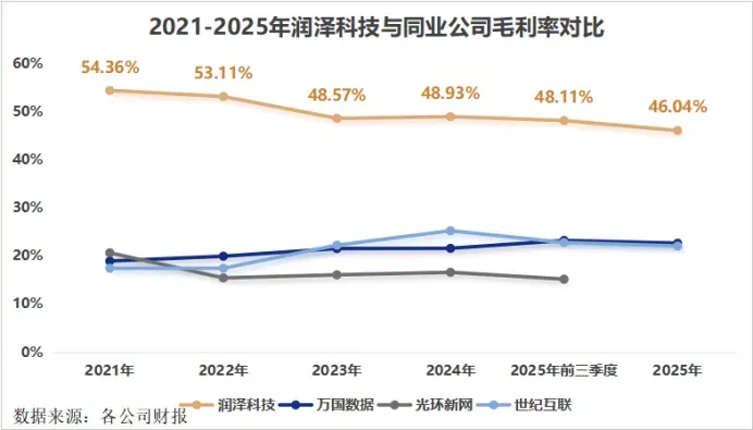近年来,润泽科技的毛利率维持在48%左右,明显高于同行的万国数据、光环新网、世纪互联等同行。