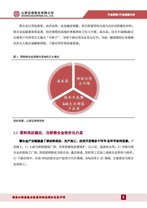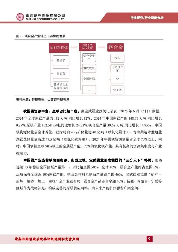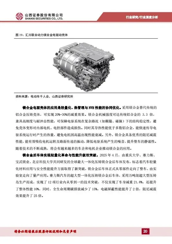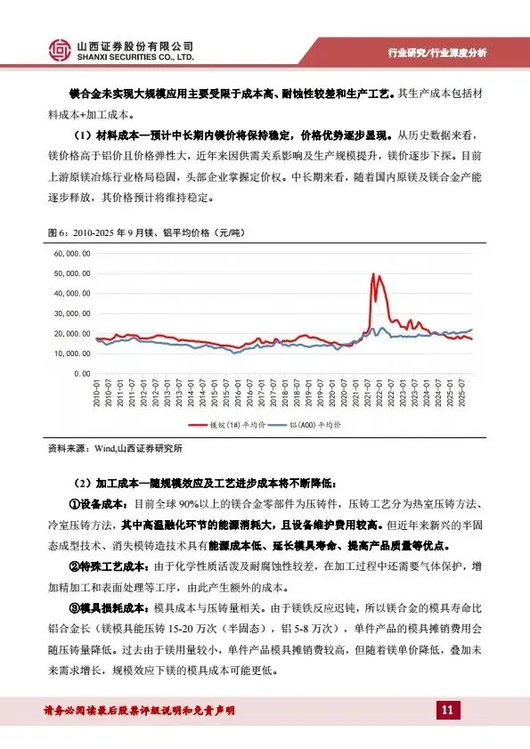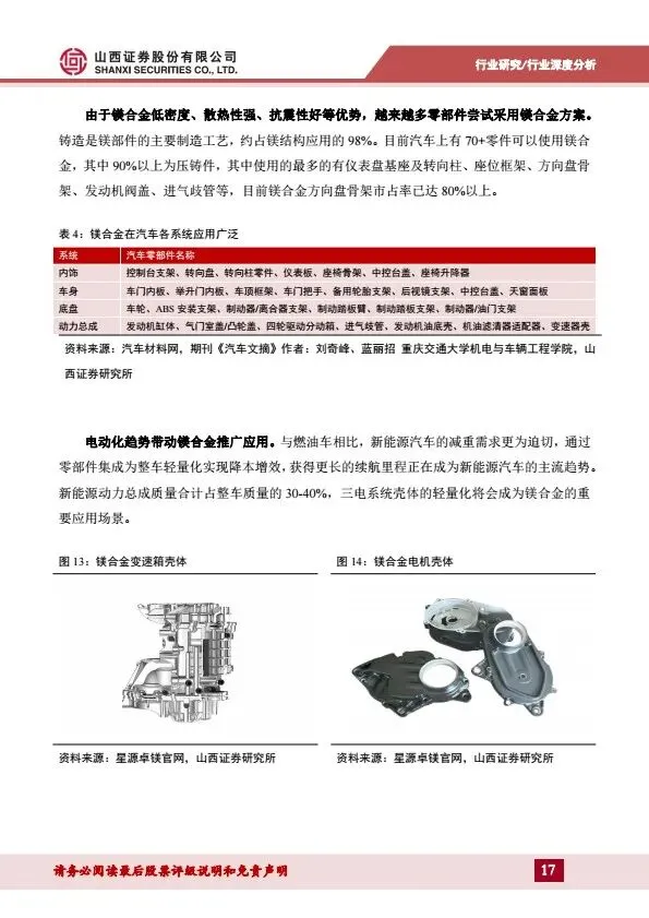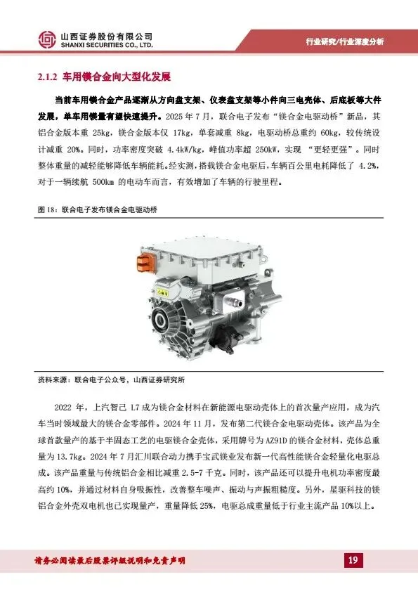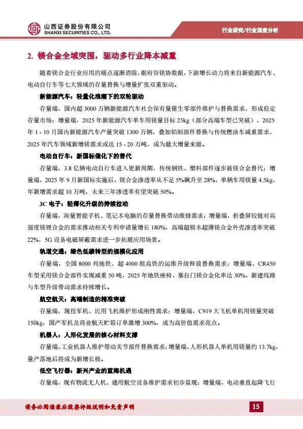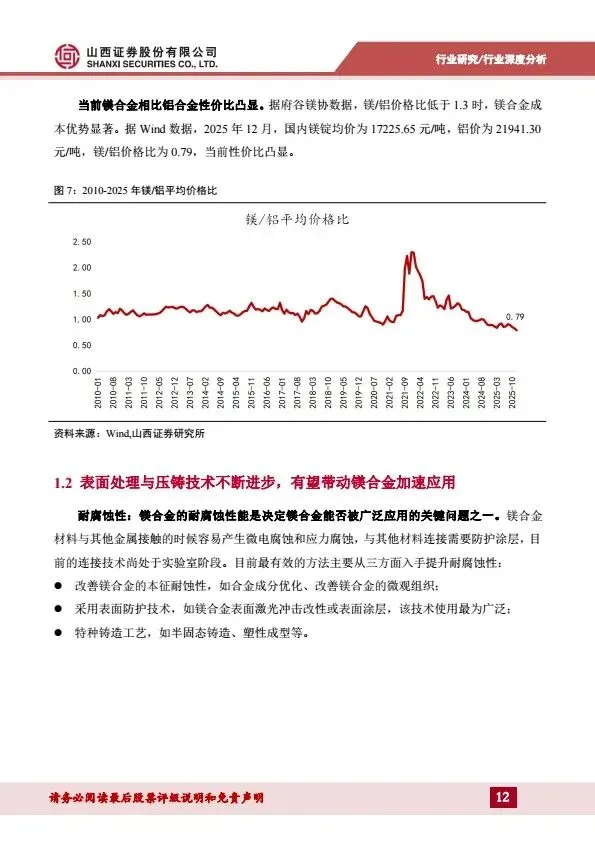 摘要:双碳目标与新能源产业发展下,汽车轻量化需求持续爆发,镁合金作为减重效果突出的材料,正迎来规模化落地的拐点。本文系统梳理产业逻辑:中国镁资源全球占比超70%,掌控90%以上产能,当前镁/铝价格比降至0.79,性价比凸显。新能源汽车、电动自行车、人形机器人成为三大核心驱动,下游应用从传统小件向电驱壳体等大件升级,单车用镁量快速提升,产业从出口依赖转向内需锚定,为汽车材料行业投资者提供参考。