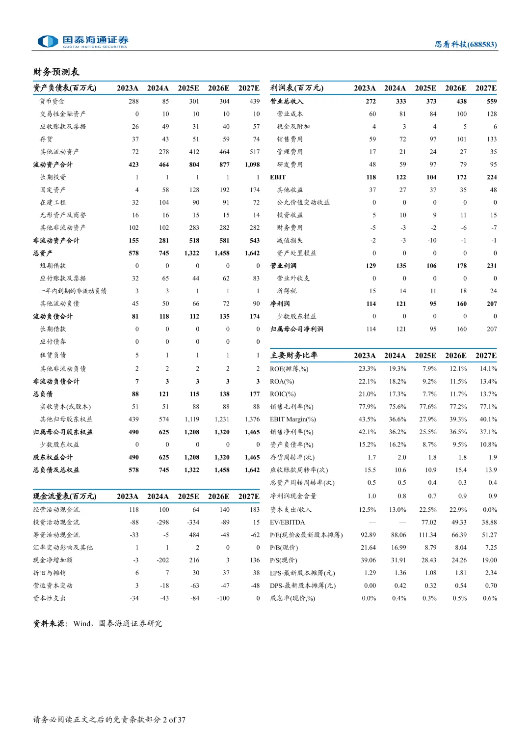 财务预测给了一个比较清楚的轮廓。营业收入从2023年的2.72亿元、2024年的3.33亿元,预计到2025年3.73亿元,2026年4.38亿元,2027年5.59亿元。