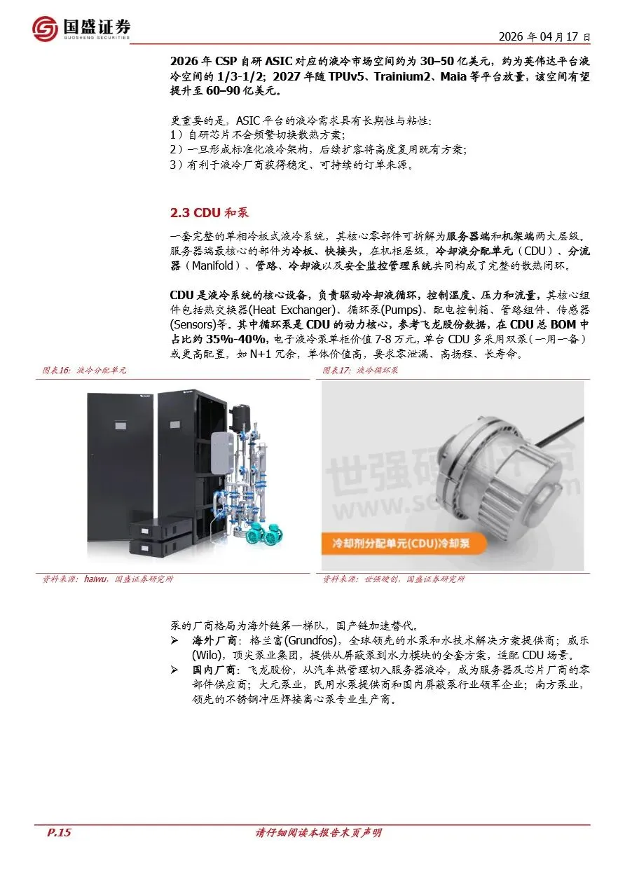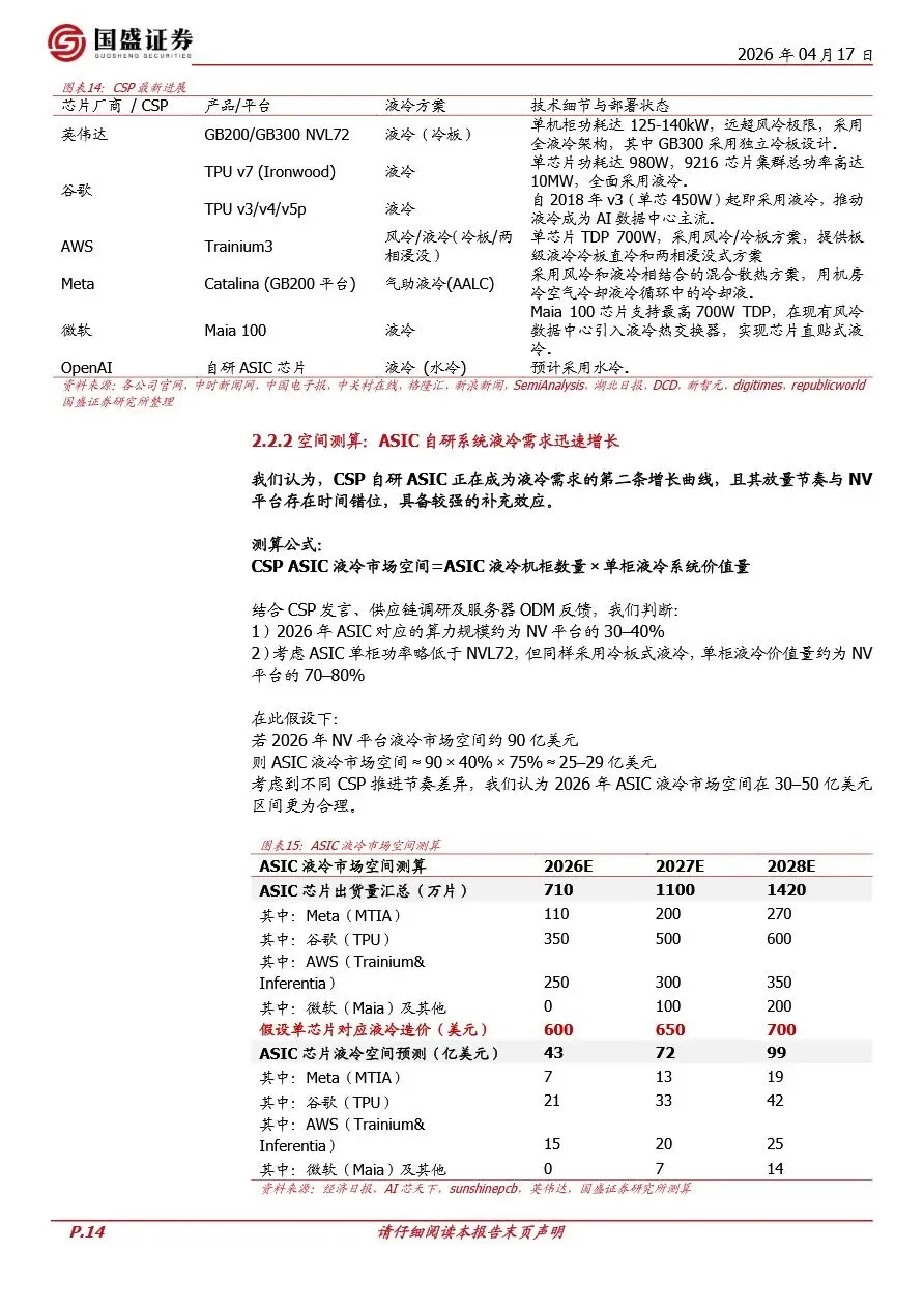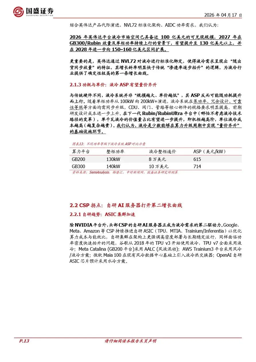 液冷技术正步入快速发展期,其推动力主要源自算力平台的升级与云服务提供商(CSP)对高效数据中心建设的投入。随着NVIDIA等厂商高功耗算力平台的普及,如GB200及后续GB300、Rubin系列,单机柜功率密度急剧上升,传统风冷技术已难以满足散热需求,液冷因此成为必然选择。这一趋势不仅为液冷市场打开了百亿美元级别的空间,还促使液冷技术从可选配置转变为算力平台的标配,加速了液冷技术的标准化与规模化应用。同时,头部CSP如Google、Meta、Amazon等加速自研ASIC与定制化AI服务器,进一步推高了数据中心的功率密度,为液冷市场带来了第二条增长曲线。液冷行业因此迎来了供需两旺的局面,具备全链条能力、深度绑定主流算力平台的头部厂商将显著受益。