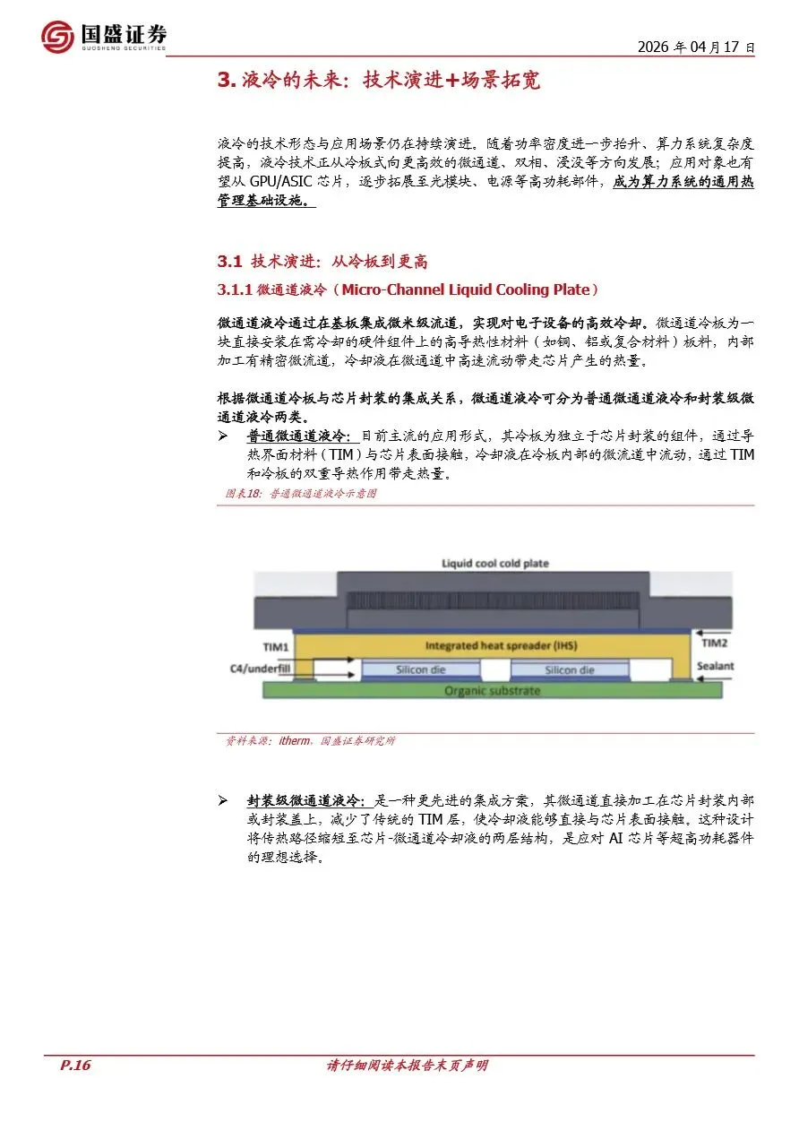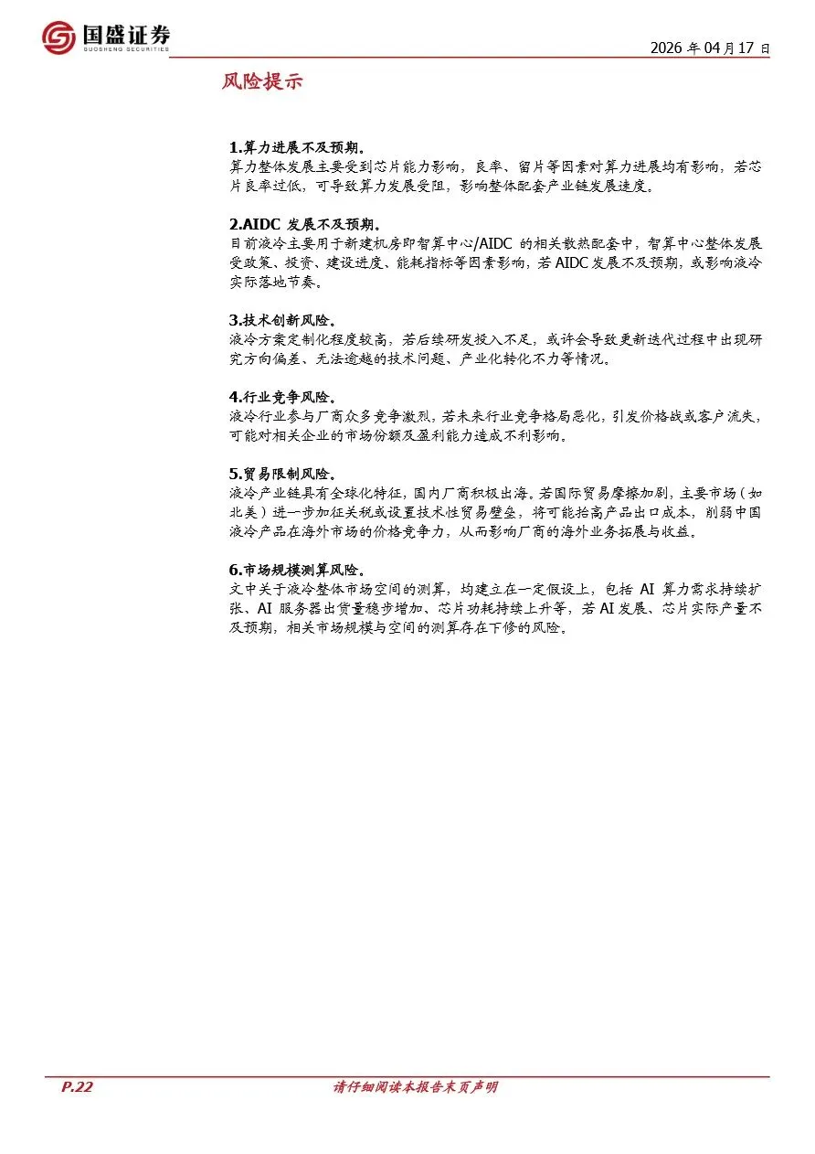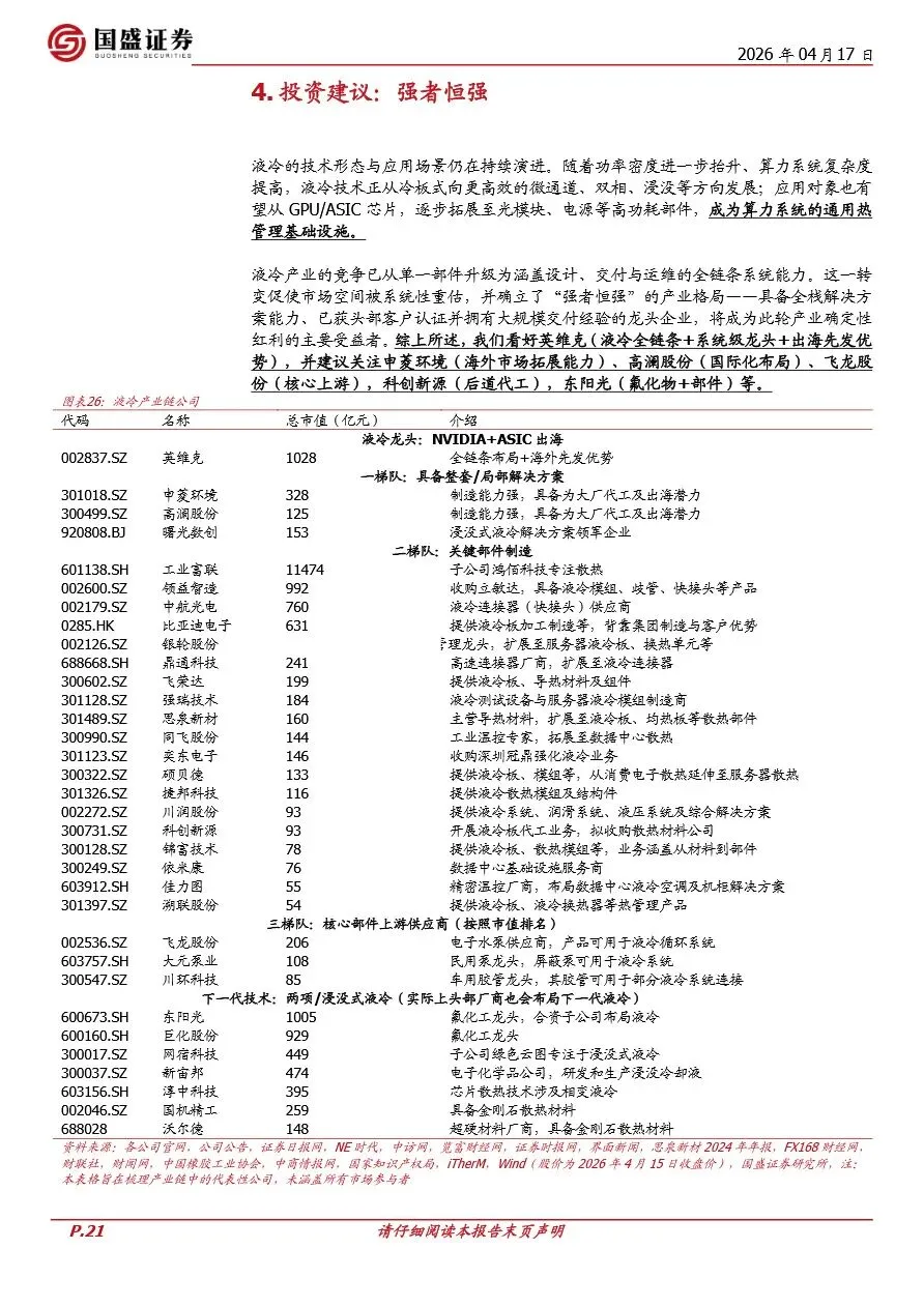 液冷市场的快速增长不仅体现在规模的扩大上,更在于技术的不断演进与应用场景的拓宽。面对日益增长的功率密度挑战,液冷技术正从传统的冷板式向更高效的微通道、双相乃至浸没式液冷方向发展,以满足AI服务器、光模块、电源系统等高功耗部件的散热需求。特别是随着光模块速率的提升和电源系统功率的增加,液冷散热方案在这些领域的应用前景广阔,有望成为算力系统的通用热管理基础设施。此外,液冷产业链的竞争格局也在逐步清晰,具备系统级解决方案能力、规模化交付经验及长期可靠性验证能力的头部厂商将占据主导地位,推动行业向“强者恒强”的方向发展。投资者应重点关注在NVIDIA平台及头部CSP供应链中具备稳定份额、并拥有系统级交付能力的液冷厂商,以把握行业发展的先机。