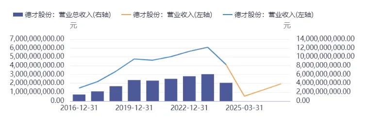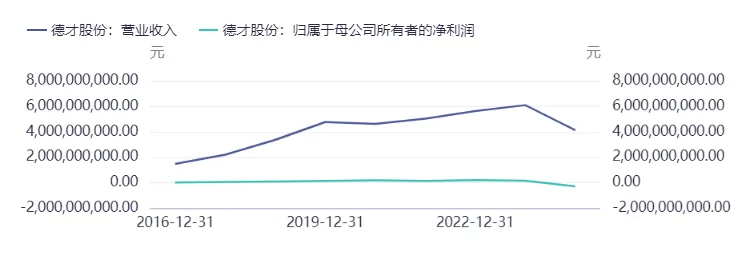 政策支持助力德才股份应对挑战。在政策环境变化的背景下,德才股份面临市场需求整体放缓、行业竞争加剧等多重挑战[7]。公司近5年的营业收入和净利润数据显示出明显的起伏,2022年营业收入为4,133,844,642.75元,2021年为6,102,836,313.32元,2020年为5,637,800,589.42元,2019年为4,129,545,911.99元,2018年为6,098,801,923.74元[7]。净利润方面,2024年归属于上市公司股东的净利润为-286,819,081.03元,2023年为156,286,187.10元,2022年为-283,520,000.00元。公司业务规模缩减、客户付款周期影响导致信用减值损失增加是主要因素[7]。尽管面临挑战,德才股份通过顺应政策导向,积极调整业务结构,有望在未来实现新的增长。