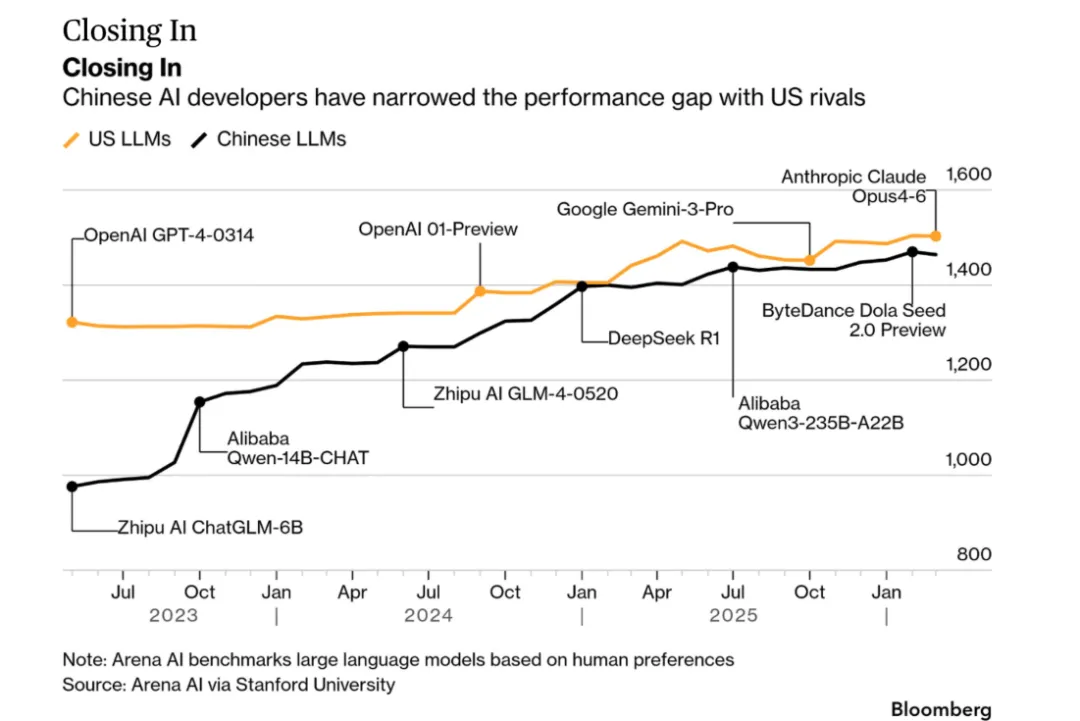 【呼吸研报】为什么中国平价AI让硅谷感到担忧中国AI模型比美国主导平台更便宜、更具适应性,研究显示它们如今几乎同样熟练。这是如何发生的? 中国人工智能公司无法匹敌美国竞争对手的资金实力,美国政府也剥夺了它们获得最先进芯片来训练AI模型的机会。然而,中国正在逼近美国在这一领域的领导地位。 DeepSeek和Alibaba Group Holding Ltd.等中国开发者专注于设计这样的系统:它们不需要最强大的硬件,却能达到几乎与表现最好的AI模型相当的水平。中国还押注“开放权重”AI软件,即向开发者开放内部参数,使其能够共享、研究和调整这些参数,以此推动AI在国民经济中的快速采用。所有这些都在挑战美国占主导地位的商业模式。美国模式建立在投入数十亿美元,并让用户为最强大的专有AI技术支付高价的基础之上。 以下是关于中国AI需要了解的内容,以及它对OpenAI Inc.、Anthropic和其他美国巨头构成多大威胁。 效率 华盛顿实施的出口管制限制了中国获得美国设计芯片的能力。这些芯片由于能在每片硅片上压入更多晶体管,因此相比中国竞争产品,速度约快20%,能耗最高低30%。中国科技界试图通过开发更加“压缩”的AI软件来克服这一劣势。这意味着,要获得与美国表现最佳AI模型相当的输出结果,所需计算步骤更少。 实现这一点的一种方式,是采用一种被称为“混合专家”的技术。当用户向DeepSeek或阿里Qwen这样的中国聊天机器人发出提示时,模型不需要调动整个“神经网络”来生成回应,这一过程被称为推理。相反,它会激活被称为专家的专门子网络,而这些专家只调用软件可用计算能力中的一小部分。 OpenAI和Anthropic等美国实验室的模型,在单次交互中能够处理的信息总量以及回答的复杂程度方面,往往仍具有优势。但为了实现这一点,它们会激活模型中更多可用的“神经元”,从而消耗更多算力。根据DeepSeek公布的性能数据,在其最新模型V4-Pro中,任一时刻实际参与工作的参数不到3%。 逼近 来源: Arena AI, 经Stanford University注:Arena AI基于人类偏好对大型语言模型进行基准测试 2025年1月底,在DeepSeek展示新模型R1后,全球科技股下跌。该模型以看似仅为美国AI聊天机器人开发成本一小部分的代价,提供了可比的性能。如今,虽然OpenAI、Anthropic和Google仍提供全球表现最佳的AI工具,但根据LiveBench大型语言模型排名,DeepSeek和规模较小的中国竞争对手Moonshot已经进入前12名。而且它们便宜得多:截至2月,OpenAI的GPT-5.2每百万输出token收费14美元。token是AI模型根据用户提示处理的数据单位。相比之下,DeepSeek的V3.2-Exp每百万token收费42美分,OpenAI价格约为DeepSeek的33倍。 Anthropic曾指控DeepSeek、Moonshot以及另一家中国AI实验室MiniMax发动“工业规模蒸馏攻击”,即通过2.4万个欺诈账户非法提取其专有Claude模型能力,以获取优势。此后,Anthropic、OpenAI和Google一直合作,试图遏制此类做法。DeepSeek、Moonshot和MiniMax没有回应置评邮件。 开放架构 新一代AI工具的工作方式,是吸收人类记录的各种信息,从数据中识别模式,并记录音节、词语、声音或像素之间最常见的关系。由此,它们构建出庞大的神经网络,能够拆解书面提示的组成部分,并基于训练数据返回最可能有用的回应。 美国领先平台不会公开ChatGPT、Claude或Gemini等AI模型的参数。因此,第三方AI开发者要么无法复制这些模型,要么必须为此付费。尽管中国AI公司在训练系统使用了哪些数据方面同样可能保持保密,但许多公司已经开放了模型训练过程中被赋予数值并不断调整的参数,也就是所谓权重,供外界下载。这使大学、初创企业和小型科技公司能够在这些模型基础上继续开发和调整,使它们更好地执行特定任务,而且无需额外成本。 这种方式实际上将国家级AI研发进行了众包,降低了模型维护和更新成本。模型灵活性的提升,也使AI更容易被广泛行业采用。 DeepSeek发布R1模型权重后,该模型迅速获得采用。开发者已经制作出面向金融、医疗和中文任务的R1版本。阿里巴巴Qwen系列AI模型截至1月下载量突破10亿次,超过Mark Zuckerberg旗下Meta Platforms Inc.的Llama平台,成为下载量最高的开源AI模型家族。阿里巴巴表示,Qwen已在全球催生超过20万个衍生AI模型。 中国地方当局一直在资助开放权重模型,并鼓励AI社区兴起。这些社区托管数干个模型和数据集,将其作为可供本地企业共享使用的公共资产。中国政府认为,这种方式虽然可能削弱单个科技公司的利润,却能扩大该技术在整个经济中的采用,并将其视为一种软实力工具。中国积极支持相关倡议,例如2025年7月的全球AI治理行动计划,该计划试图让低收入国家的软件开发者更容易获得AI模型。 能源 训练和运行AI服务会消耗大量电力,AI服务的快速采用正在给全球能源网络带来压力。在一些国家,建设新的发电站、太阳能和风电场、输电线路、变电站和变压器以应对需求激增,正被证明是一项艰难任务。 在中国,这一问题相对较小,因为中国一直以快于其他国家的速度增加发电能力。在中国部分地区,例如内蒙古,来自可再生能源的充足且廉价电力,推动了数百个专门用于训练AI模型的数据中心建设。 中国政府正在限制AI公司的电费,为它们相对海外竞争对手提供竞争优势。国家正在补贴部分全国最大数据中心一半的电力成本,前提是这些数据中心只使用中国芯片。 产业 在世界许多地区,推动AI采用的
