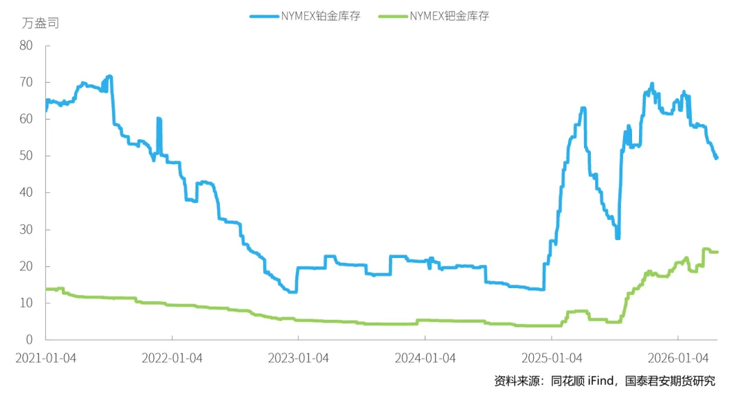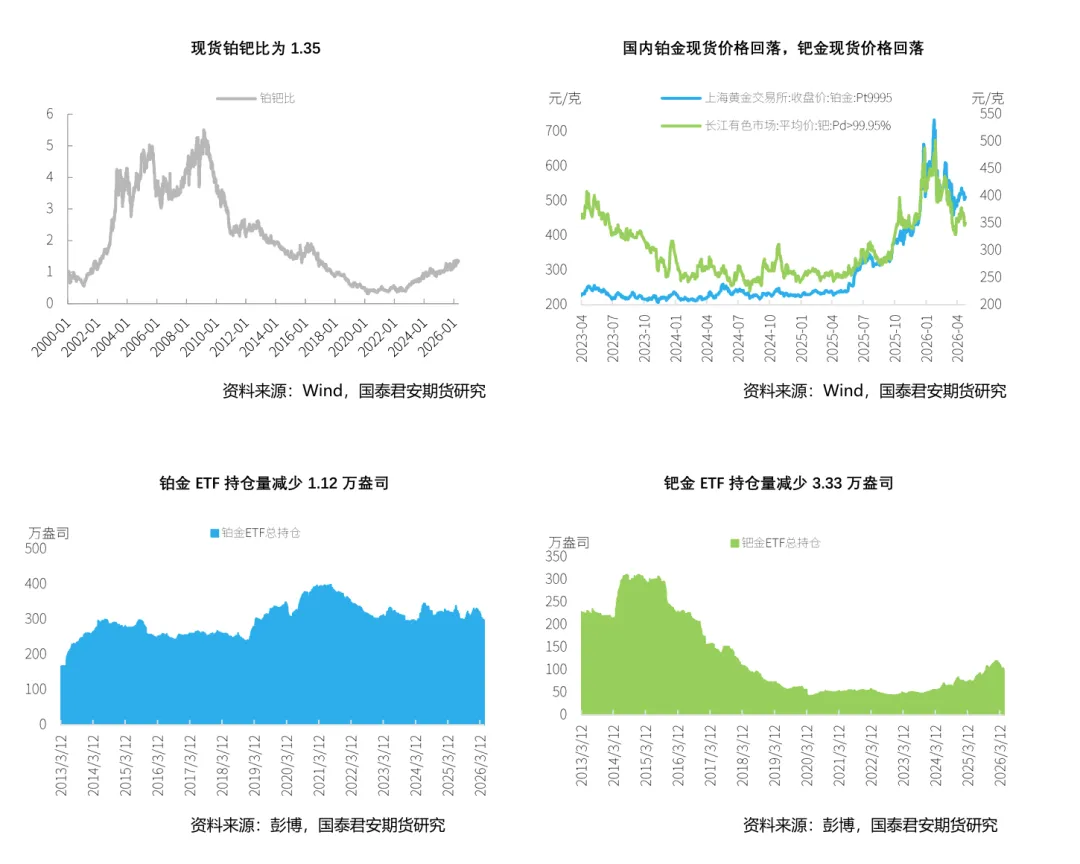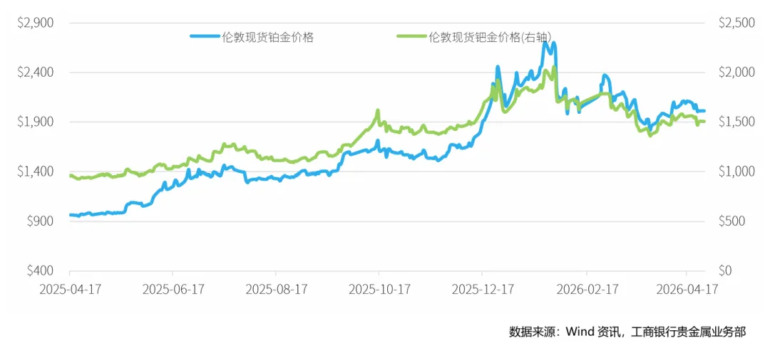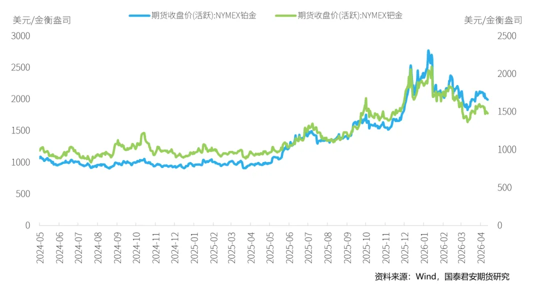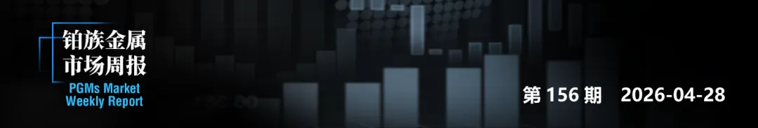 本周,铂金期货价格随宏观情绪的转弱有所下跌,截至2026年4月24日,NYMEX铂金期货价格收盘价为2021美元/盎司,周累计下跌4.42%。钯金方面,本周NYMEX钯金期货同样下跌,周五收盘价为1506.5美元/盎司,周下跌4.17%。