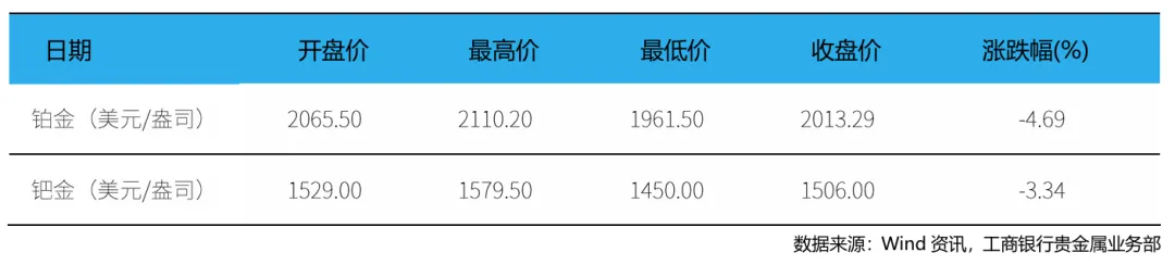本周(4月20日 – 4月26日,下同),现货铂金开盘价为2065.5美元/盎司,最高价为2110.2美元/盎司,最低价为1961.5美元/盎司,收盘价为2013.29美元/盎司,周累计下跌4.69%。现货钯金开盘价为1529美元/盎司,最高价为1579.5美元/盎司,最低价为1450美元/盎司,收盘价为1506美元/盎司,周累计下跌3.34%。