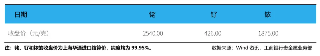 根据上海华通的数据显示,截至4月24日,99.95%现货铑金进口结算价为2540元/克,上涨2.01%。99.95%现货钌金进口结算价为426元/克,下降2.29%。99.95%现货铱金进口结算价为1875元/克,下降5.06%。
