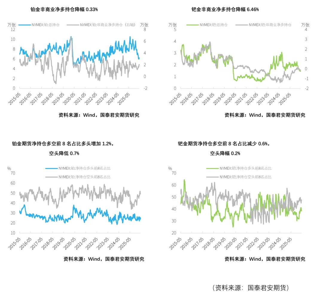 截至2026年4月21日,铂金总持仓较上周减少455张,其中非商业多头方面减少275张,非商业空头持仓较上周减少208张,降幅2.42%。因此,非商业净多头持仓减少67张,降幅0.33%。钯金方面,总持仓增加273张,增幅1.86%,其中非商业多头持仓增加200张,增幅2.99%,空头增加132张,增幅1.71%,因而非商业净多持仓增加68张,降幅6.46%。在净持仓多空前8名占比上,本周铂金方面净持仓多头占比增加1.2%,空头占比降低0.7%,钯金方面多头占比减少0.6%,空头占比降幅0.2%。