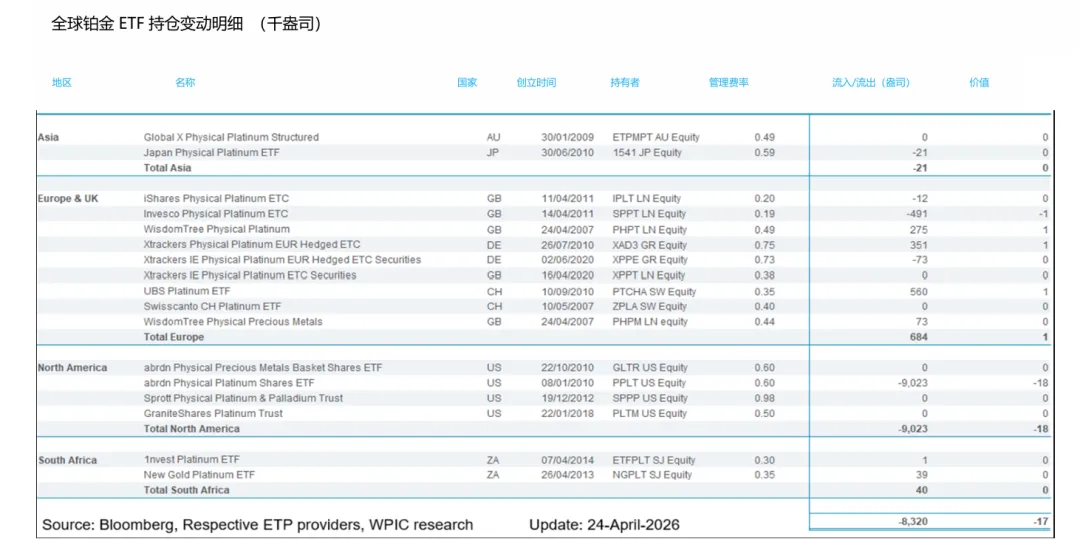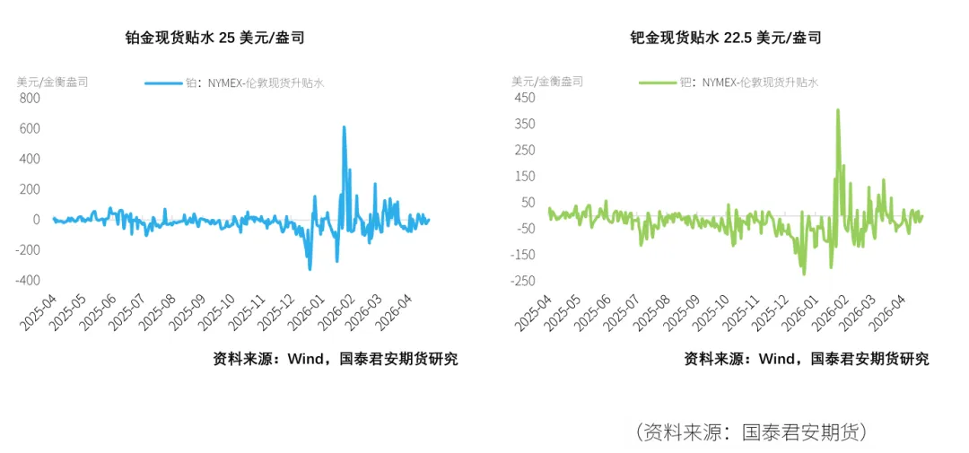 截至2026年4月24日,当周NYMEX铂金库存去库1.53万盎司,钯金期货库存持平。在现货升贴水方面,本周铂金升贴水有所波动,以周五收盘价来看贴水25美元/盎司。钯金同样转为波动,周五贴水22.5美元/盎司。ETF持仓量情况,铂金持仓量回落,其全球ETF持仓量本周减少1.12万盎司,钯金持仓量回落,ETF持仓量本周减少3.33万盎司。