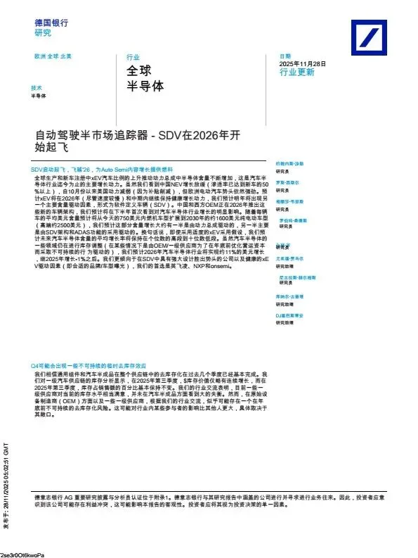 摘要:2026年,软件定义汽车(SDV)成为汽车半导体行业新增长引擎,行业结束去库存迎来复苏。本文系统梳理产业逻辑:此前xEV是汽车半导体核心增长动力,2026年SDV架构开始规模化落地,单车半导体含量将从当前ICE车的750美元,提升至2030年BEV的1600美元,其中SDV与ADAS贡献近半增量,预计2026年行业营收增长11%,为汽车半导体投资者提供产业参考。