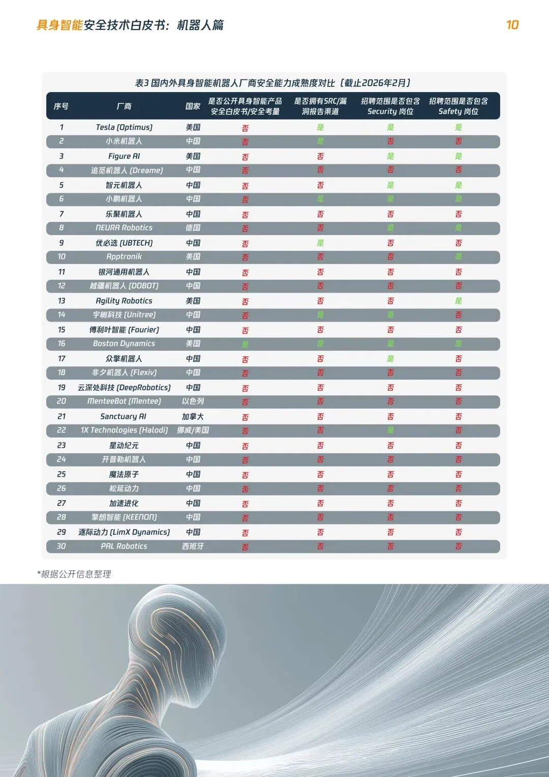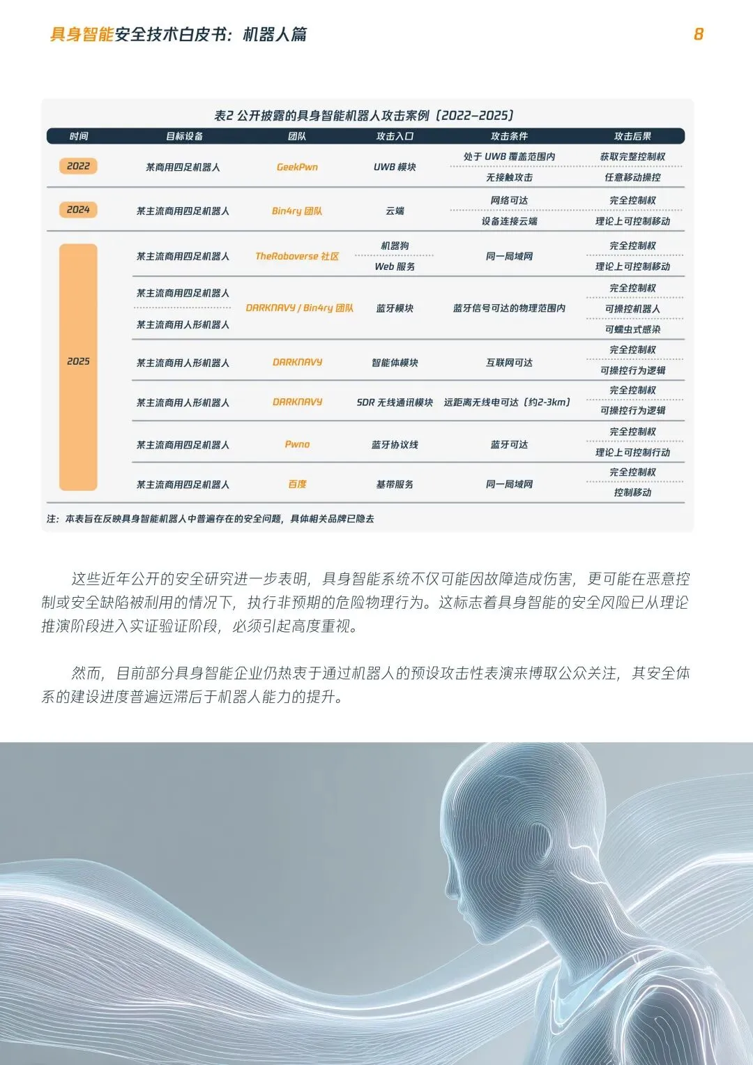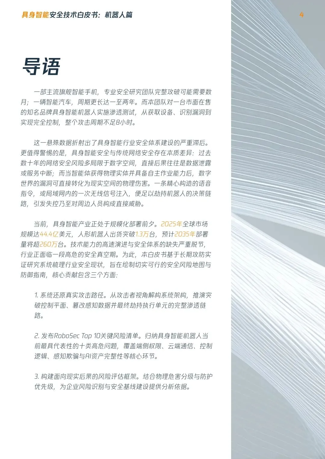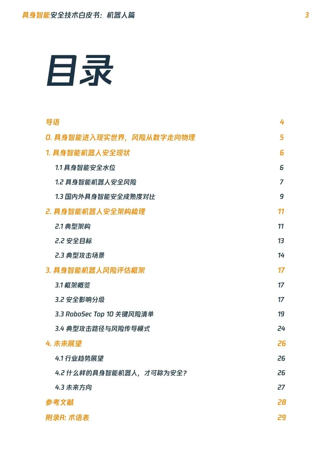 摘要:具身智能机器人进入规模化落地前夜,行业安全体系严重滞后,数字漏洞可直接转化为物理伤害,当前正处于高危安全真空期。本文系统梳理安全现状:提出平台/终端/设备三层安全架构,明确四大安全目标,构建五级安全影响分级,发布RoboSecTop10关键风险清单,覆盖全维度威胁,为行业从业者提供安全建设参考。