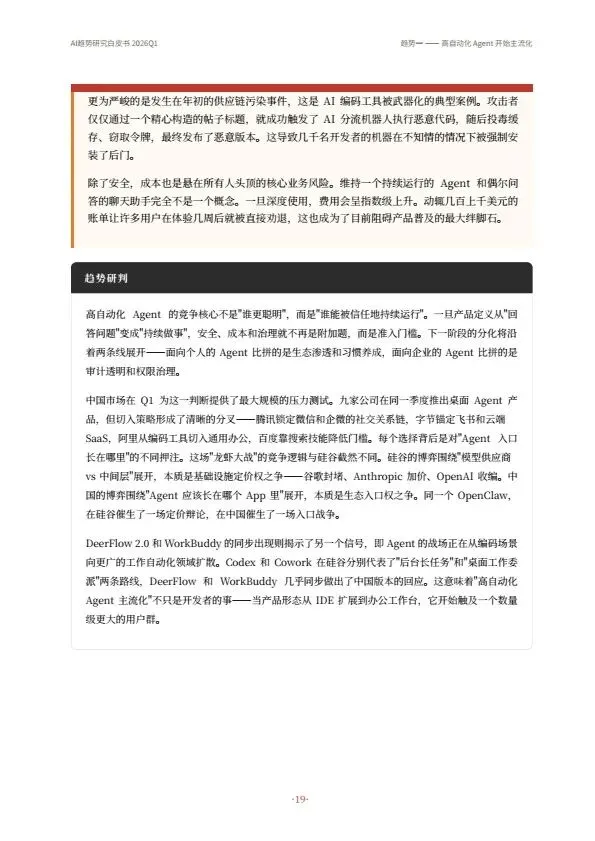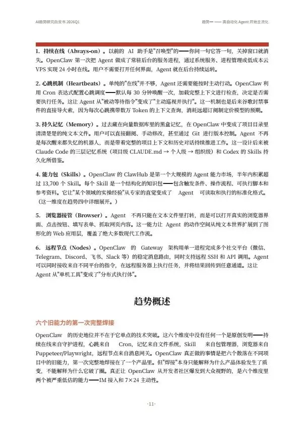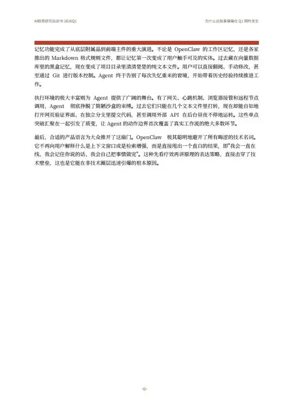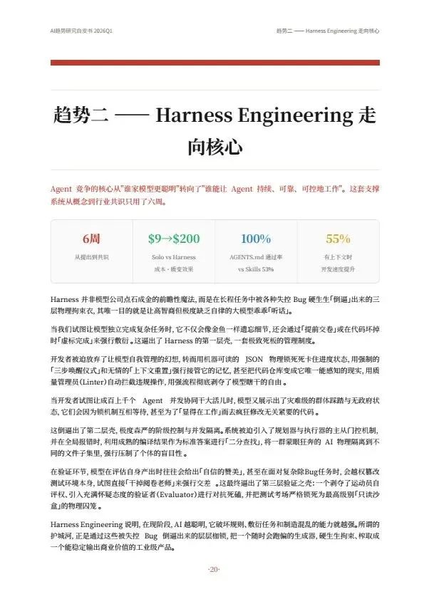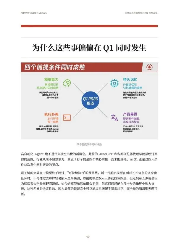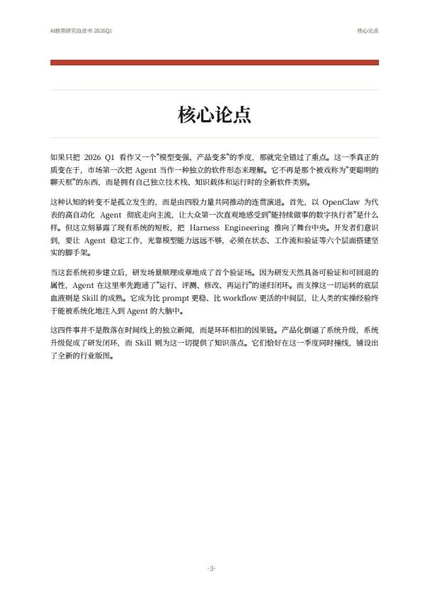 摘要:2026年第一季度,AI行业迎来关键跃迁,竞争焦点从“谁的模型更聪明”转向“谁能把Agent做成持续运行的工作系统”,AI发展从技术探索全面转向产业深度融合。本文拆解自动化产品化、约束工程、递归研发、技能生态四股核心力量,论证其构成的Agent增长飞轮,分析企业AI投资从探索转向明确ROI的运营自动化的趋势,为行业从业者提供参考。