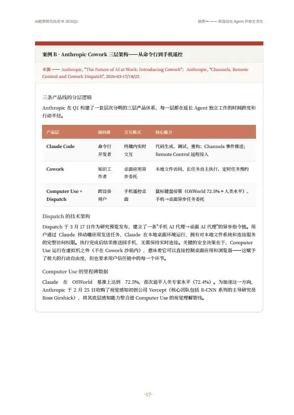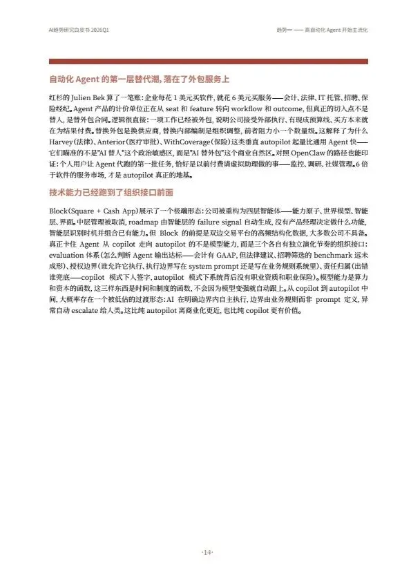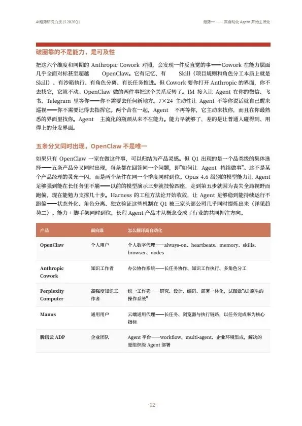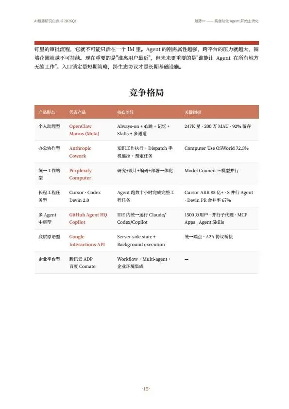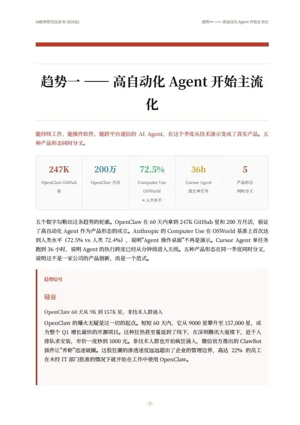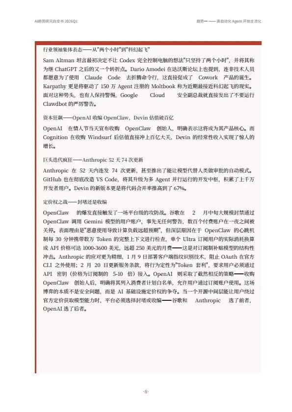 摘要:2026年第一季度,AI行业迎来关键跃迁,竞争焦点从“谁的模型更聪明”转向“谁能把Agent做成持续运行的工作系统”,AI发展从技术探索全面转向产业深度融合。本文拆解自动化产品化、约束工程、递归研发、技能生态四股核心力量,论证其构成的Agent增长飞轮,分析企业AI投资从探索转向明确ROI的运营自动化的趋势,为行业从业者提供参考。