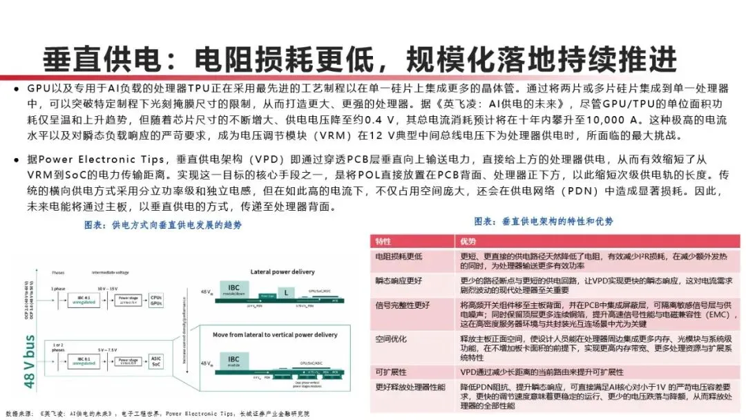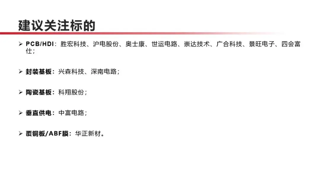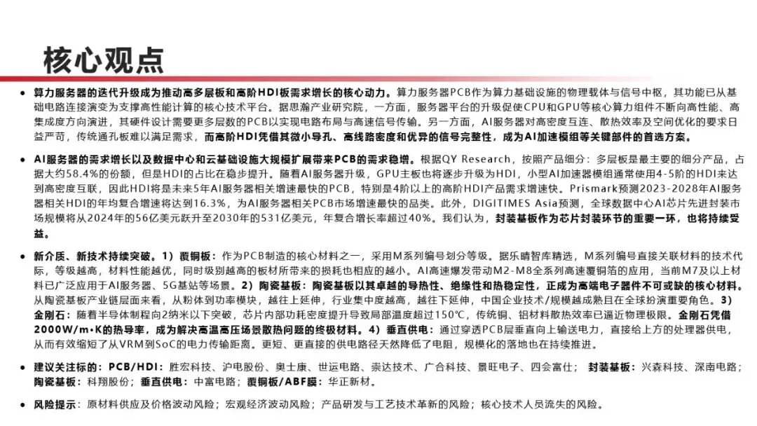 PCB行业在AI浪潮的推动下,不仅在传统服务器市场表现出色,还在新介质、新技术领域持续突破。覆铜板作为PCB制造的核心材料,正不断向M7及以上低损耗材料升级,以满足AI服务器和5G基站等高速传输需求。陶瓷基板以其卓越的导热性、绝缘性和热稳定性,在高端电子器件中占据不可或缺的地位,市场规模持续扩大。金刚石材料凭借其超高的热导率,成为解决高温高压场景散热问题的终极方案,应用前景广阔。此外,垂直供电技术的引入,通过缩短电力传输距离,有效降低了电阻损耗,提高了供电效率,为AI服务器等高功耗设备提供了更为优化的供电解决方案。整体来看,PCB行业在AI技术的驱动下,正朝着高多层、高密度、高速传输和高效散热的方向快速发展,相关产业链上的企业将迎来新的增长点。