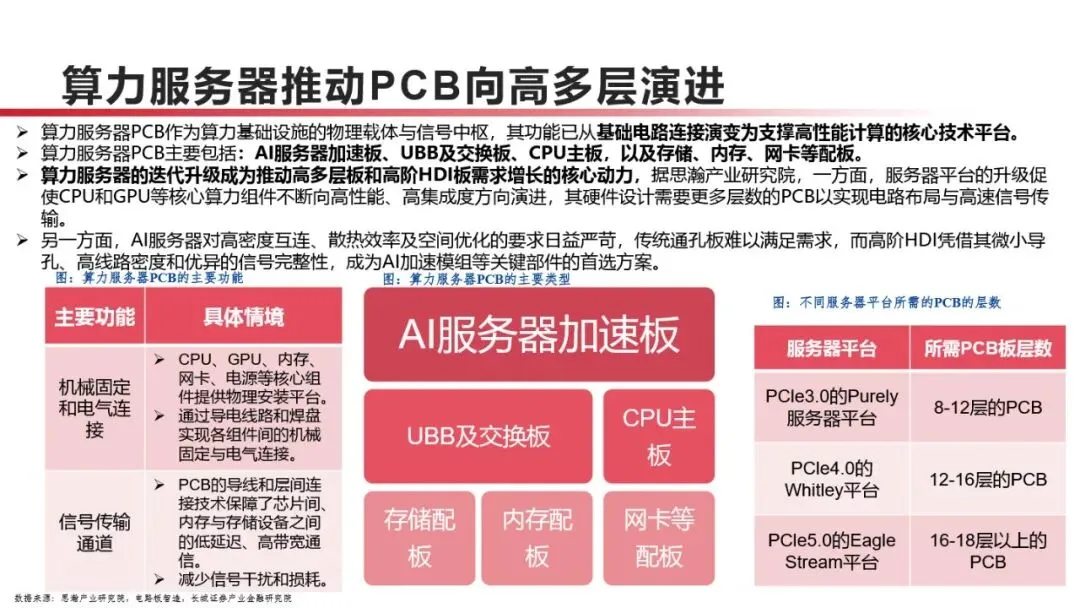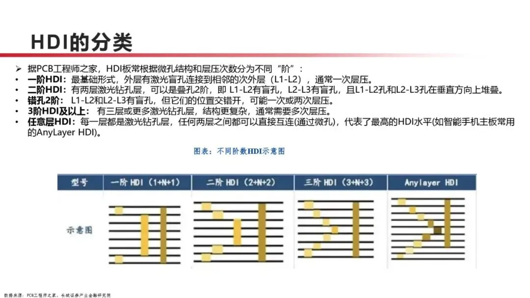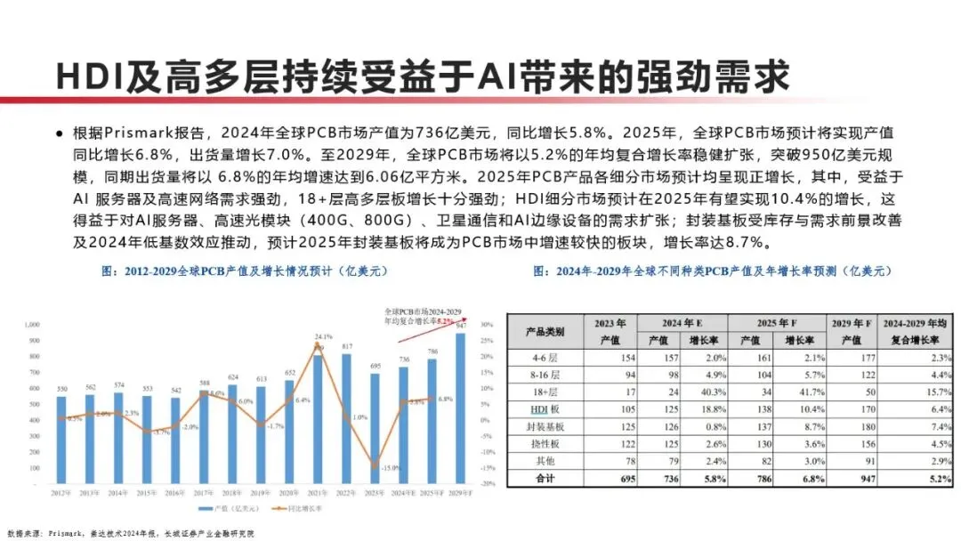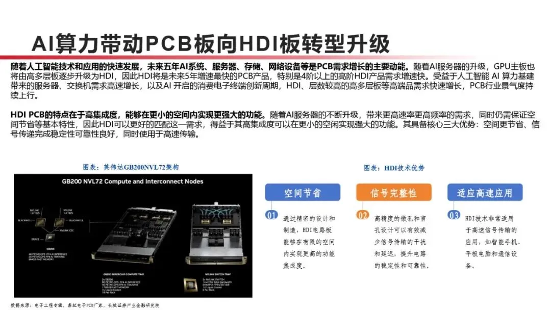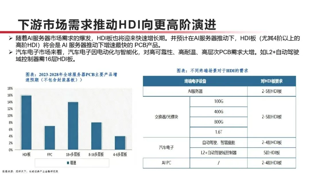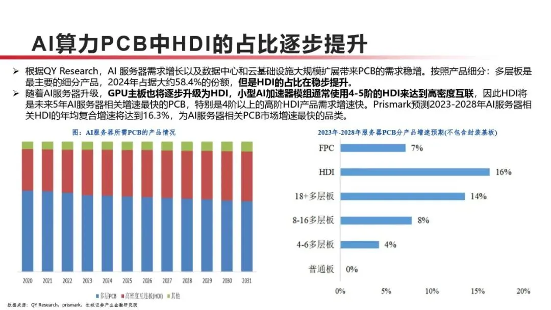 随着AI技术的迅猛发展,PCB(印制电路板)行业正迎来前所未有的发展机遇。AI服务器的迭代升级成为推动高多层板和高阶HDI板需求增长的核心动力。服务器平台的升级促使CPU和GPU等核心组件向高性能、高集成度方向演进,对PCB的层数和高速信号传输能力提出了更高要求。同时,AI服务器对高密度互连、散热效率及空间优化的严苛需求,使得高阶HDI板凭借其微小导孔、高线路密度和优异的信号完整性,成为AI加速模组等关键部件的首选方案。据预测,未来五年内,HDI板,特别是4阶以上的高阶HDI产品,将成为AI服务器相关PCB市场中增速最快的品类,年复合增长率有望达到16.3%。此外,数据中心和云基础设施的大规模扩展也进一步推动了PCB需求的稳步增长。