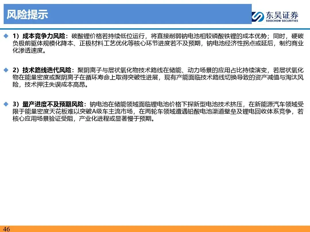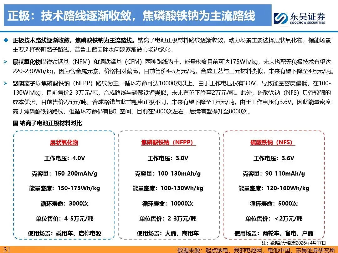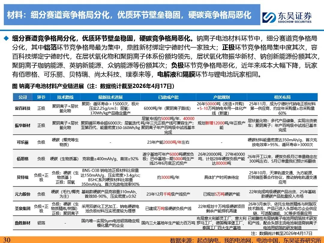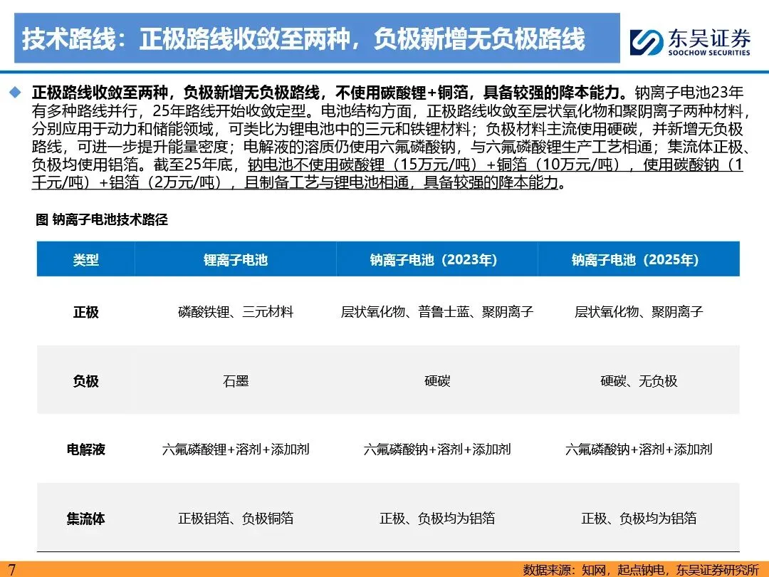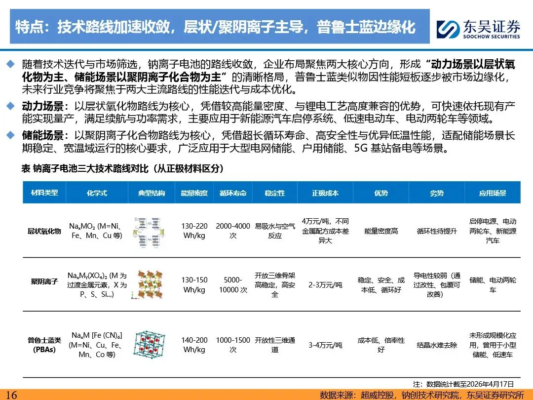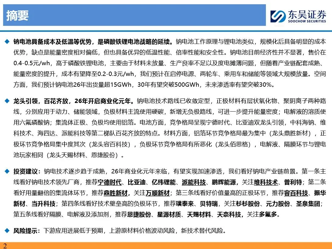 钠离子电池的技术路线已逐步收敛定型,正极材料以层状氧化物和聚阴离子为主,负极材料则向硬碳及无负极方向发展。层状氧化物路线凭借高能量密度优势,主要应用于动力领域;聚阴离子路线则凭借超长循环寿命和高安全性,在储能领域占据主导地位。无负极技术作为下一代高能量密度、低成本的重要方向,正受到宁德时代等企业的积极布局。同时,钠离子电池材料环节竞争格局分化,铝箔环节鼎胜新材等企业占据领先地位,正极和电解液环节则呈现多强竞争的态势。随着钠离子电池商业化元年的到来,相关产业链企业将迎来新的发展机遇。