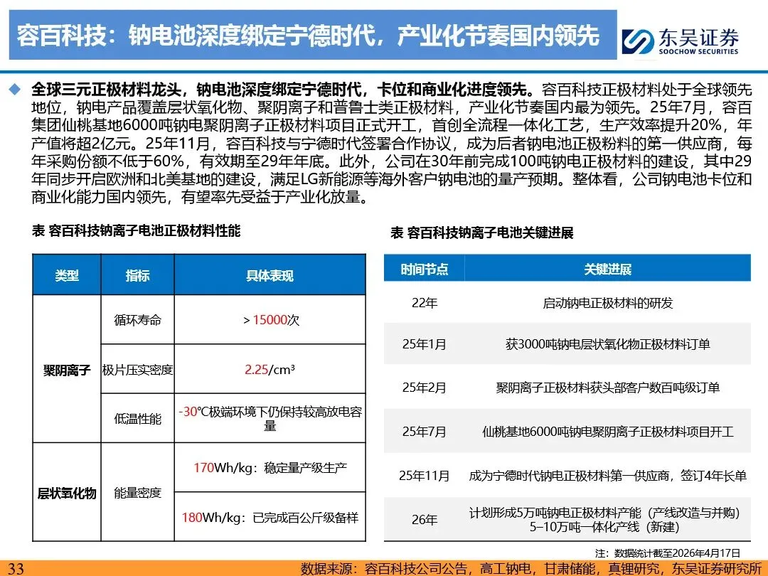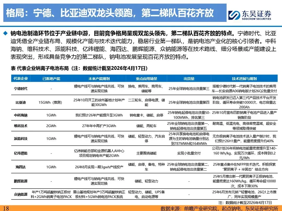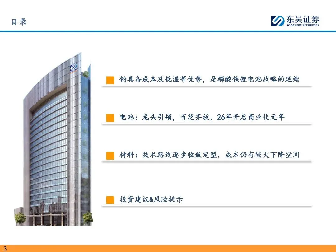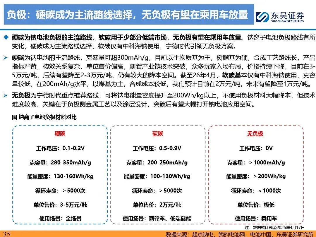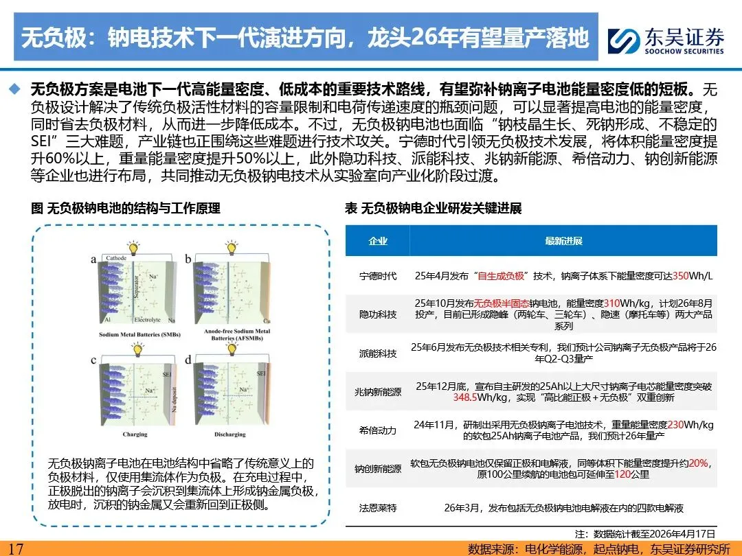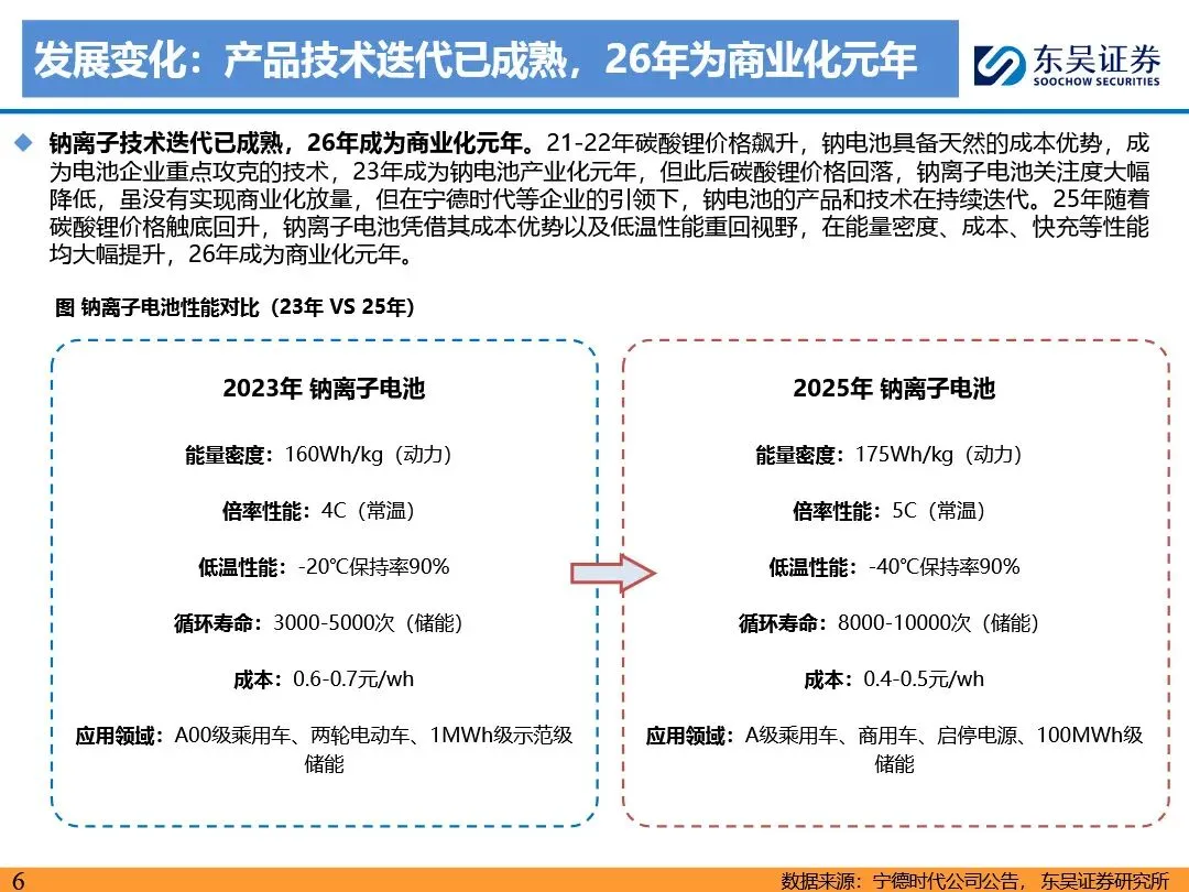 钠离子电池的技术路线已逐步收敛定型,正极材料以层状氧化物和聚阴离子为主,负极材料则向硬碳及无负极方向发展。层状氧化物路线凭借高能量密度优势,主要应用于动力领域;聚阴离子路线则凭借超长循环寿命和高安全性,在储能领域占据主导地位。无负极技术作为下一代高能量密度、低成本的重要方向,正受到宁德时代等企业的积极布局。同时,钠离子电池材料环节竞争格局分化,铝箔环节鼎胜新材等企业占据领先地位,正极和电解液环节则呈现多强竞争的态势。随着钠离子电池商业化元年的到来,相关产业链企业将迎来新的发展机遇。