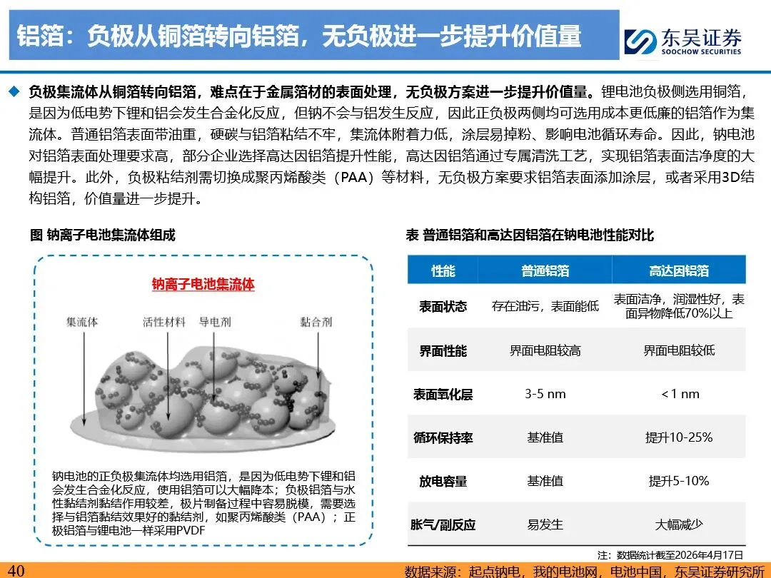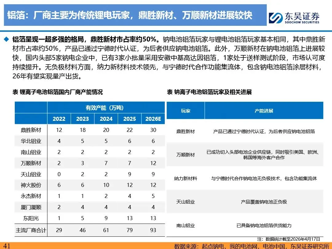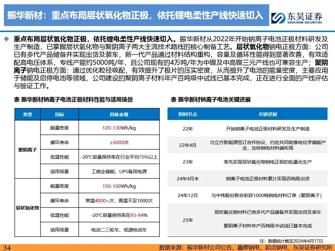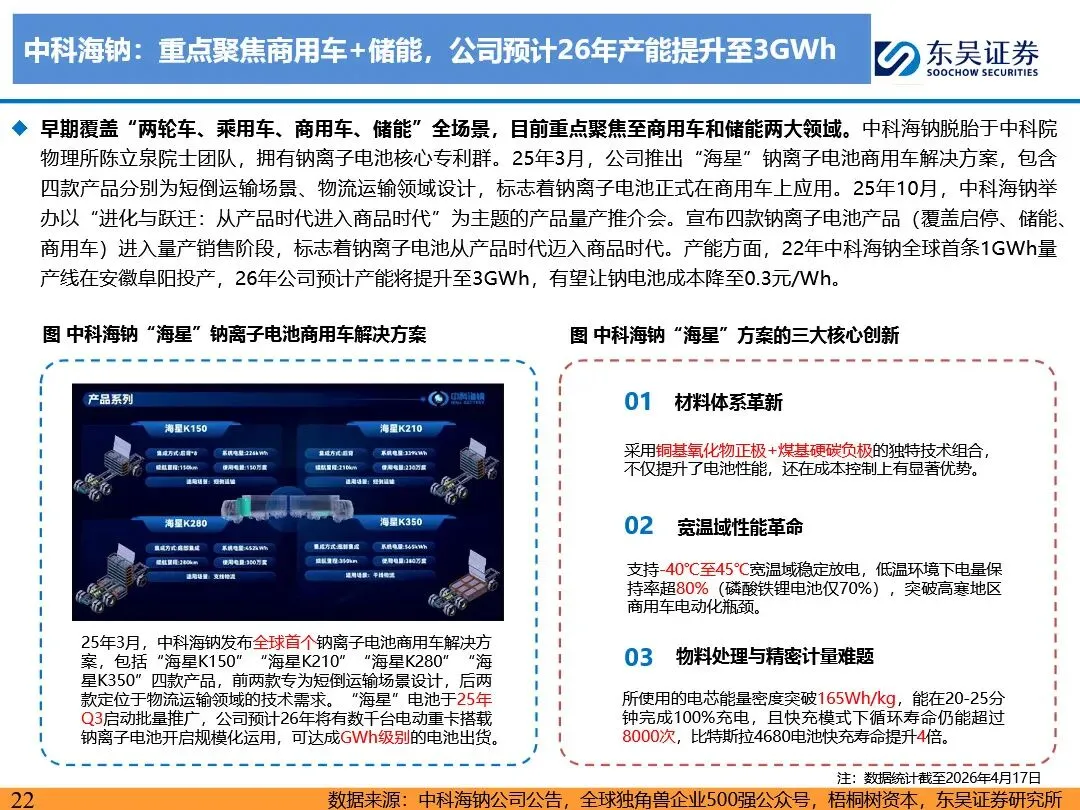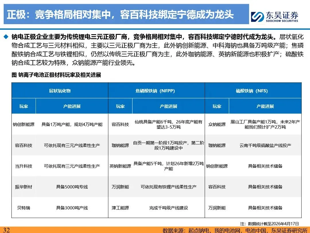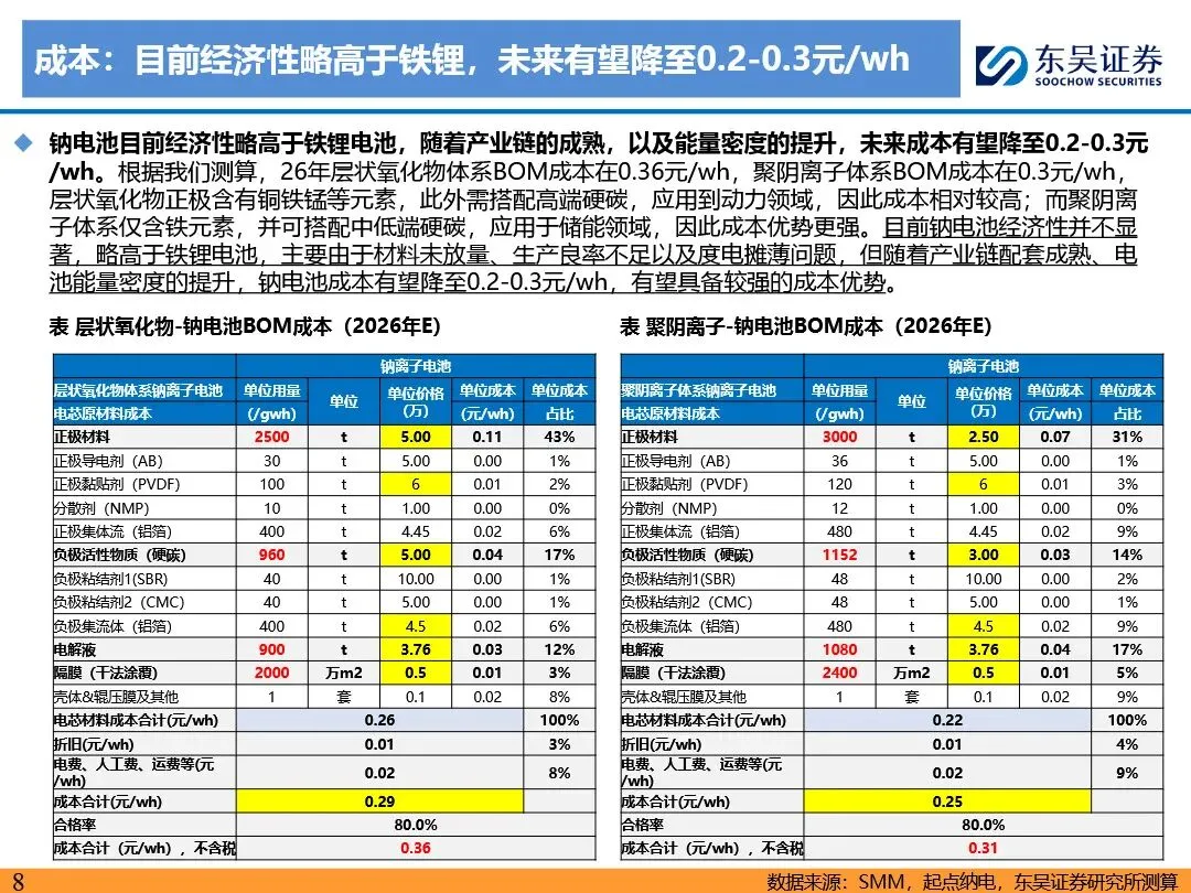 钠离子电池的技术路线已逐步收敛定型,正极材料以层状氧化物和聚阴离子为主,负极材料则向硬碳及无负极方向发展。层状氧化物路线凭借高能量密度优势,主要应用于动力领域;聚阴离子路线则凭借超长循环寿命和高安全性,在储能领域占据主导地位。无负极技术作为下一代高能量密度、低成本的重要方向,正受到宁德时代等企业的积极布局。同时,钠离子电池材料环节竞争格局分化,铝箔环节鼎胜新材等企业占据领先地位,正极和电解液环节则呈现多强竞争的态势。随着钠离子电池商业化元年的到来,相关产业链企业将迎来新的发展机遇。