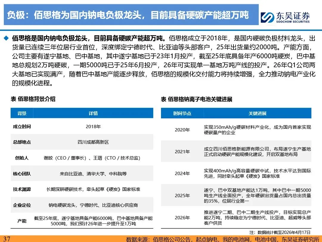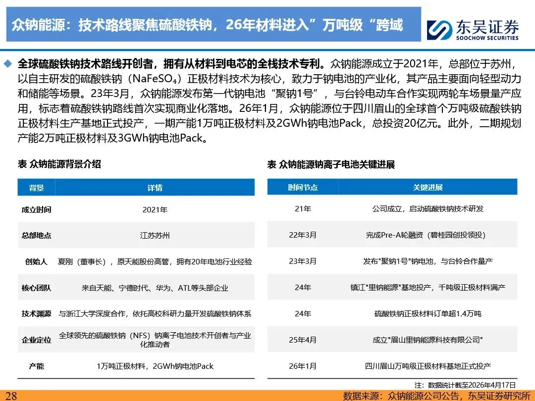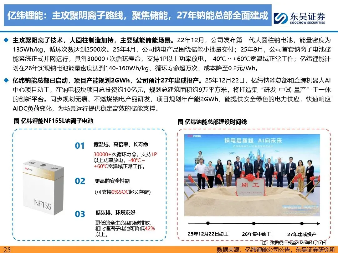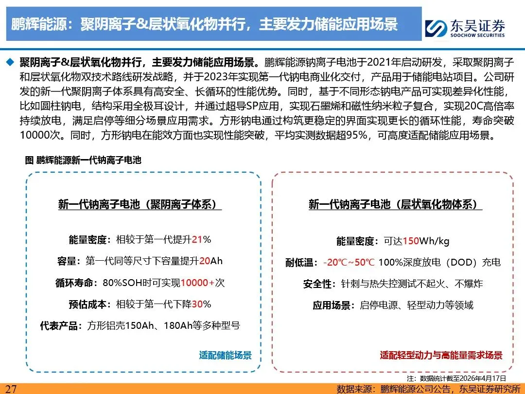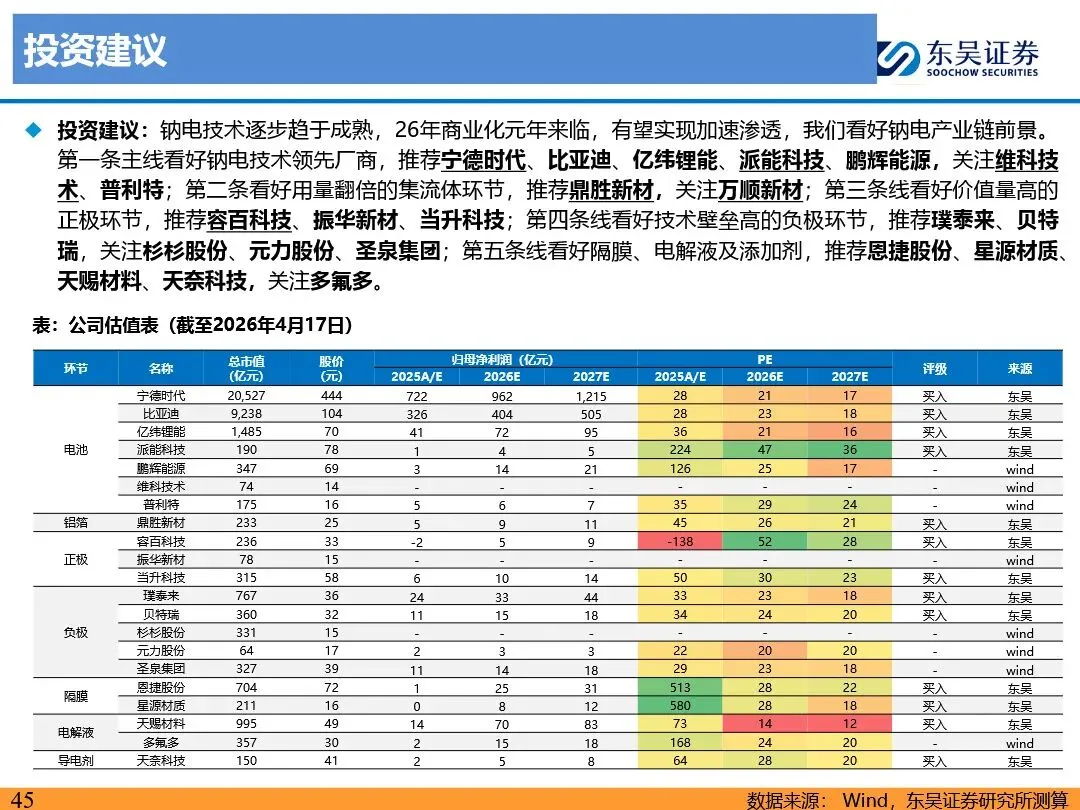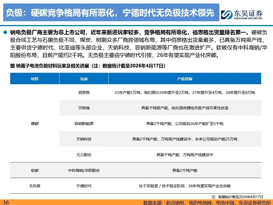 钠离子电池的技术路线已逐步收敛定型,正极材料以层状氧化物和聚阴离子为主,负极材料则向硬碳及无负极方向发展。层状氧化物路线凭借高能量密度优势,主要应用于动力领域;聚阴离子路线则凭借超长循环寿命和高安全性,在储能领域占据主导地位。无负极技术作为下一代高能量密度、低成本的重要方向,正受到宁德时代等企业的积极布局。同时,钠离子电池材料环节竞争格局分化,铝箔环节鼎胜新材等企业占据领先地位,正极和电解液环节则呈现多强竞争的态势。随着钠离子电池商业化元年的到来,相关产业链企业将迎来新的发展机遇。