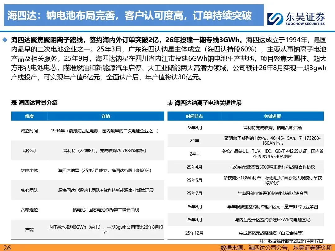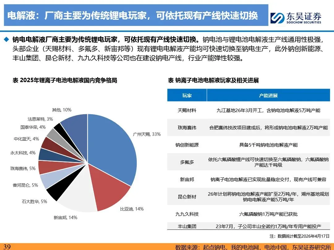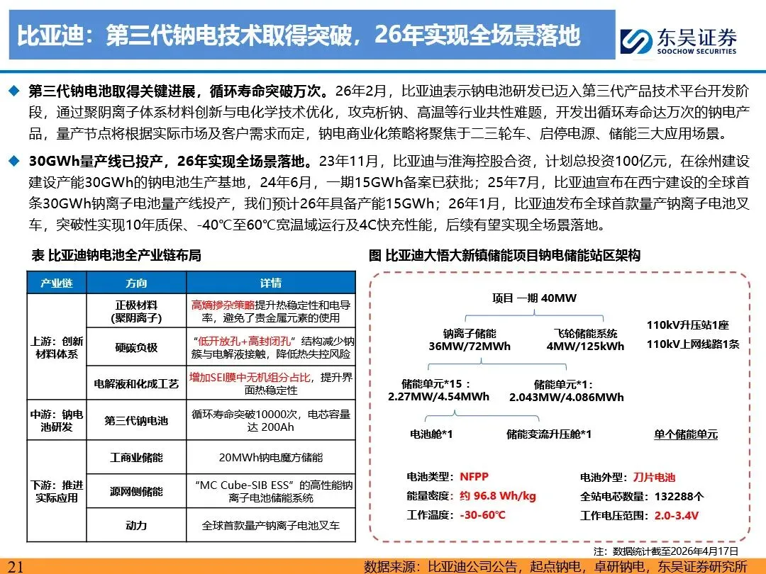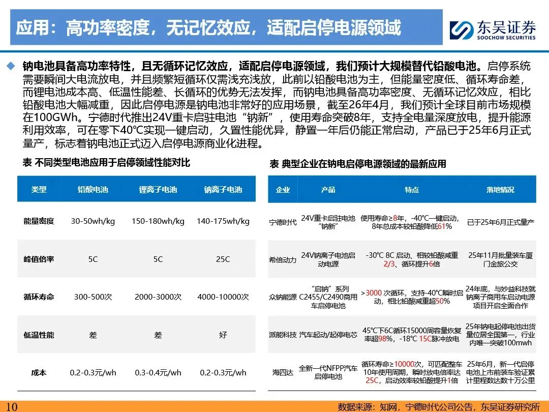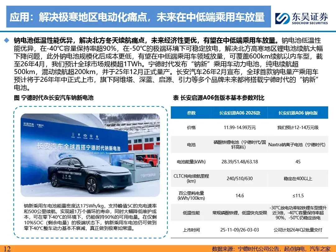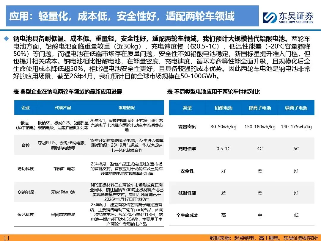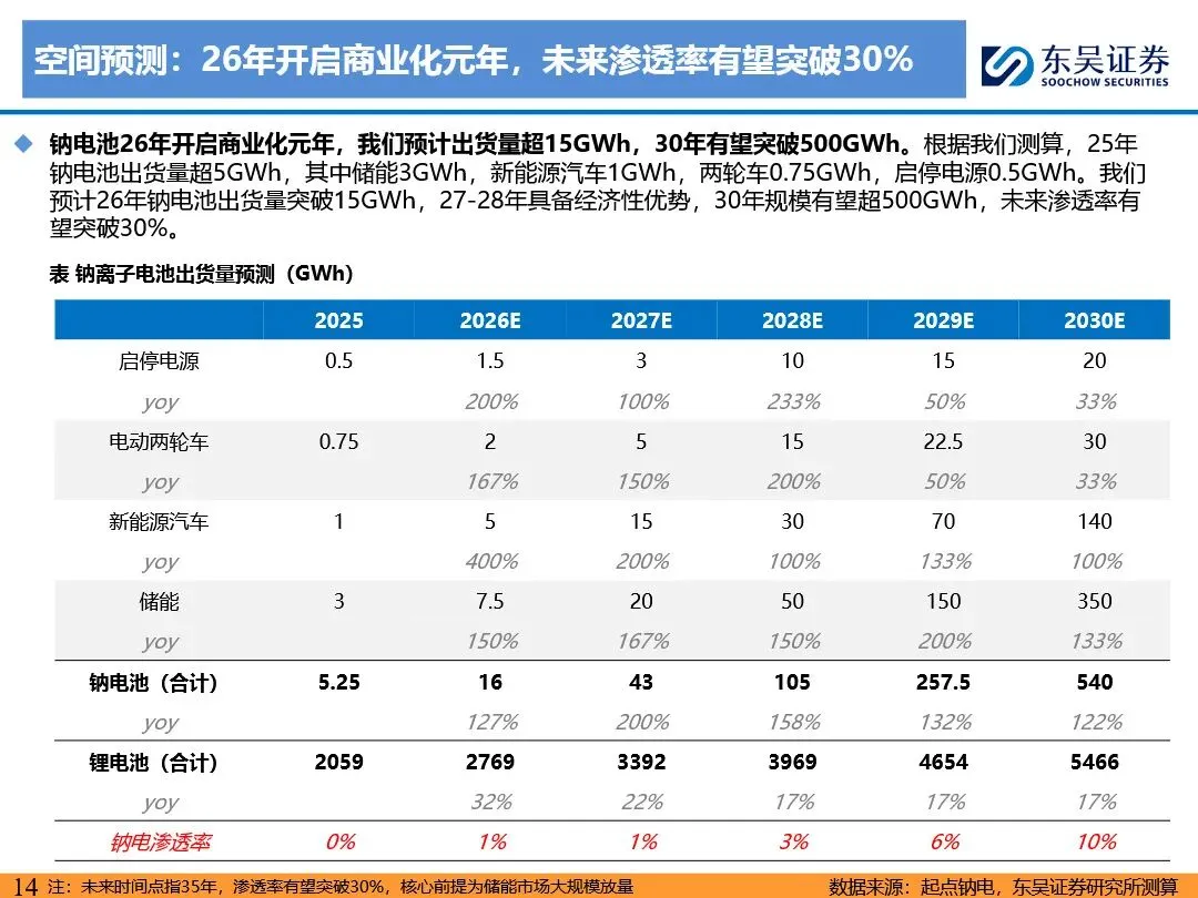 钠离子电池凭借其成本及低温性能优势,正逐步成为磷酸铁锂电池的重要补充,并在储能、启停电源、两轮车及中低端乘用车等领域展现出广阔的应用前景。随着技术迭代与产业链成熟,钠离子电池的成本有望降至0.2-0.3元/wh,经济性显著提升。预计2026年钠离子电池出货量将超15GWh,2030年有望突破500GWh,未来渗透率有望突破30%。宁德时代、比亚迪等龙头企业引领行业发展,第二梯队企业百花齐放,共同推动钠离子电池技术的商业化进程。